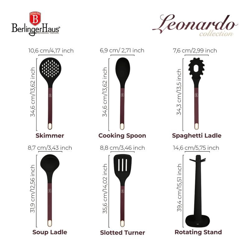 Dodejte své kuchyni styl a funkčnost s elegantní sadou kuchyňského nářadí ve výrazné matné bordeaux barvě. Šest praktických pomůcek na otočném stojanu – vše, co potřebujete pro každodenní vaření.