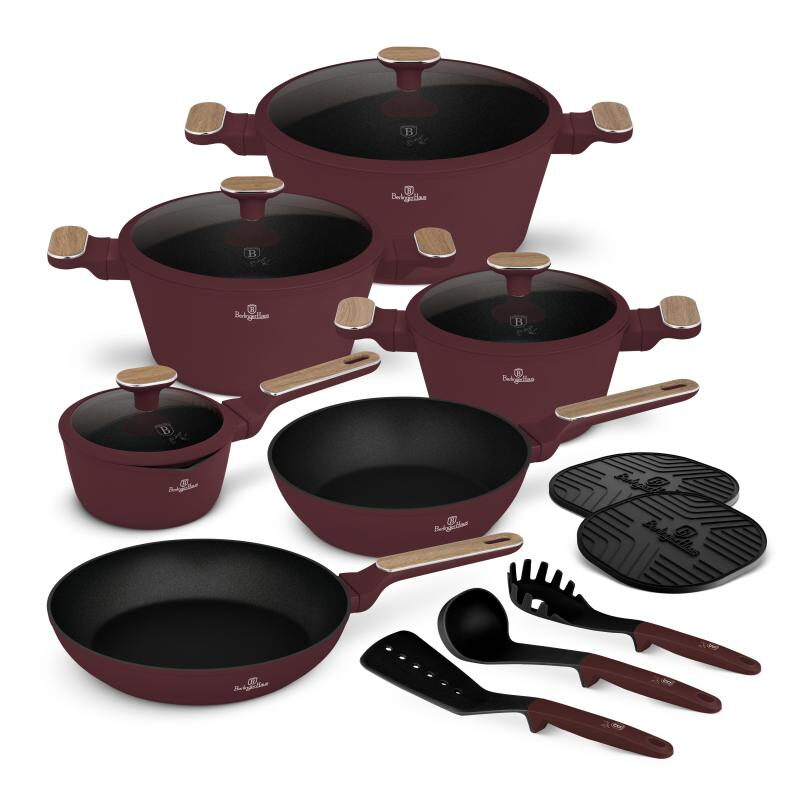 Vstupte do světa profesionálního vaření s touto exkluzivní sadou nádobí, která kombinuje lehkost kovaného hliníku s prémiovým nepřilnavým povrchem TitanPro. Každý kus je navržen tak, aby vám usnadnil přípravu pokrmů a zároveň přinesl do vaší kuchyně styl a funkčnost v minimalistickém designu v matné bordó a dřevěných detailech.