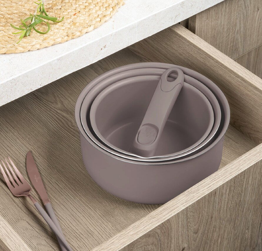Elegantní matný povrch v barvě taupe s prvky světlého dřeva dodává sadě jedinečný vzhled, zatímco turbo indukční dno poskytuje rychlé a rovnoměrné vaření. Víka z tvrzeného skla s tepelně odolným silikonovým systémem Soft Close zaručují bezpečné a tiché zavírání.