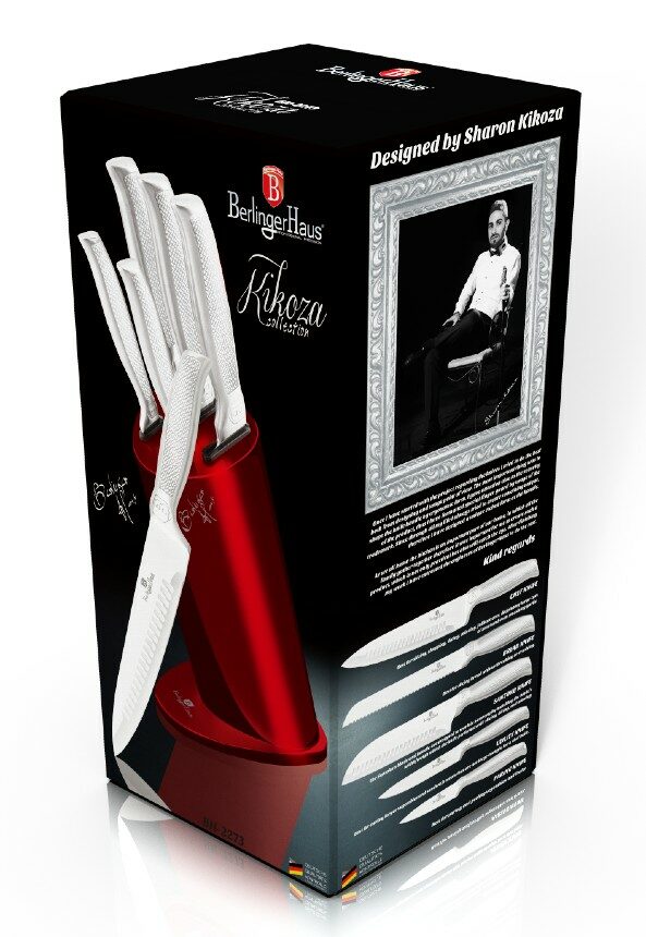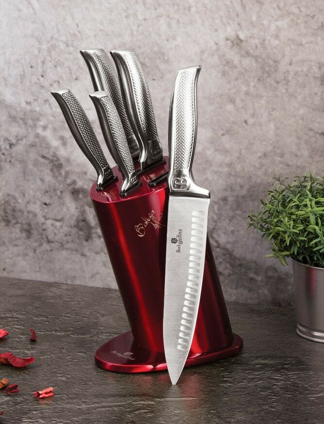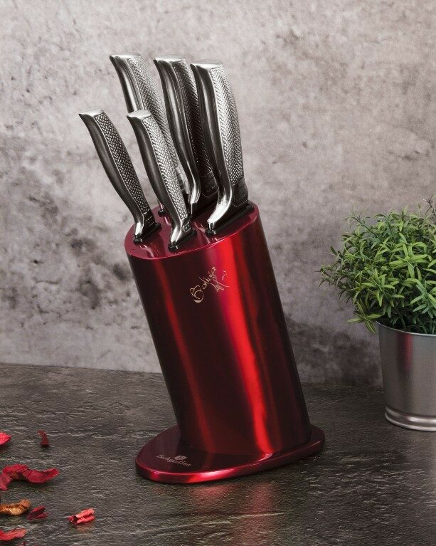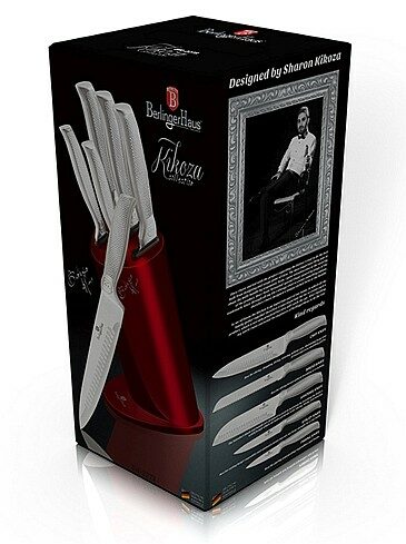 Sada nožů ve stojanu nerez Burgundy Metallic Line 6 ks Kikoza Collection je výbornou alternativou pro kuchaře různých úrovní, na jejíž výrobu byl použit kvalitní materiál: nerez ocel s nepřilnavým povrchem, vynikají perfektní ostrostí čepele a designem. Velmi oceníte i ergonomicky tvarovanou rukojeť, díky které se vám nože budou skvěle držet. Celá sada je dílem výrobce BERLINGERHAUS, jež se výrobě nožů věnuje poměrně dlouho a jsou řádně odzkoušeny.
