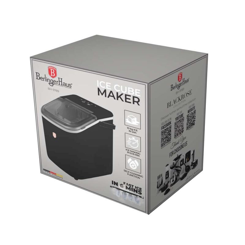 Stylový a praktický výrobník ledu Berlinger Haus vám umožní vychutnat si perfektní led během pár minut. Stačí naplnit nádrž na vodu o objemu 1,1 l a přístroj vyrobí až 9 kostek ledu za 6 minut. Vybrat si můžete mezi malými nebo velkými kostkami, takže si snadno připravíte led přesně podle potřeby.