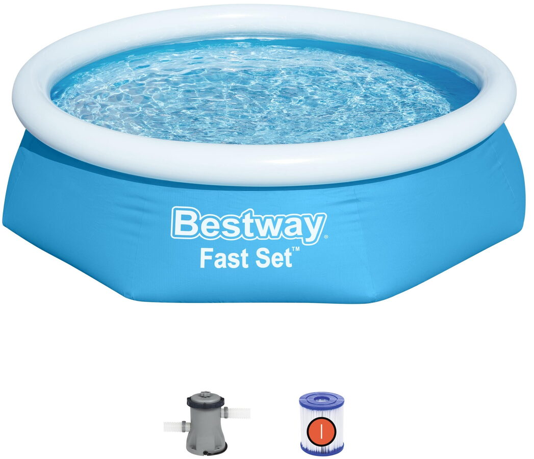 Bestway nadzemní kruhový bazén Fast Set je skvělý rodinný bazén, který sestavíte během několika minut. Stačí rovná plocha, nafouknout vrchní kruh. Tělo bazénu se zvedne, jakmile bazén naplníte vodou. Sada obsahuje filtrační čerpadlo a filtrační vložku, která udržuje vodu čerstvou a čistou. Dodává se také s vypouštěcím ventilem pro regulaci průtoku, který umožňuje rychlé vypuštění na konci sezóny. Extra silné boční stěny tohoto bazénu jsou vyrobeny z materiálu Tritech , 3-vrstvového vyztuženého materiálu s jádrem z polyesterové sítě uzavřeného mezi dvěma vrstvami PVC materiálu s vysokou rozchodností. To vytváří celkovou tloušťku 0,40-0,80 mm (rozměr 16-32) v závislosti na velikosti bazénu a nabízí vynikající pevnost a trvanlivost, takže bazén využijete i v dalších letech. Rozměr: 244 x 61 cm. Vodní kapacita: 1880 l. Obsahuje: 1 bazén, 1 filtrační čerpadlo (220-240 V) s kompatibilní kazetou 58093, 1 záplata na opravu pod hladinou vody.