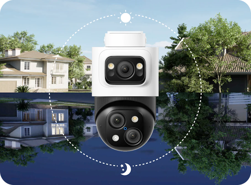 Horní širokoúhlá kamera 4K poskytuje pevný výhled 122° na celou scénu, zatímco spodní kamera 2K PTZ automaticky zaostří až na vzdálenost 50 metrů. Když horní kamera detekuje objekt, spodní PTZ kamera se na něj zaměří, automaticky ho sleduje a zaostří v ostrém, vycentrovaném záběru z vzdálenosti až 50 metrů. 360° pro kompletní pokrytí.