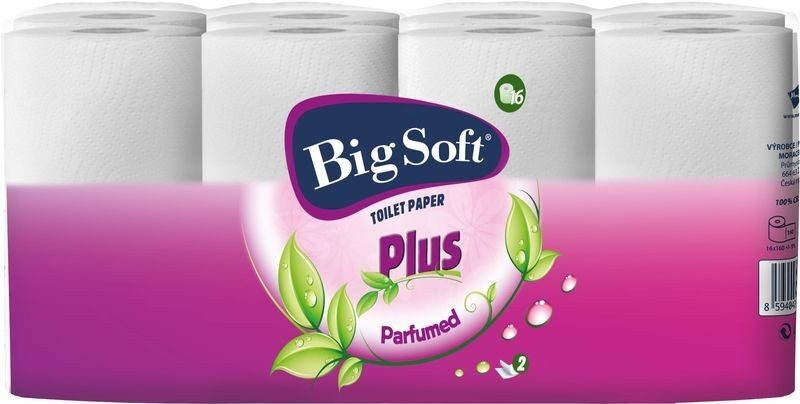 Big soft plus luxusní toaletní papír 16ks 2 vrstvy. 2-vrstvý, parfém, potisk, 16x160 útržků +/- 5 %,100 % celulóza, 18 m.