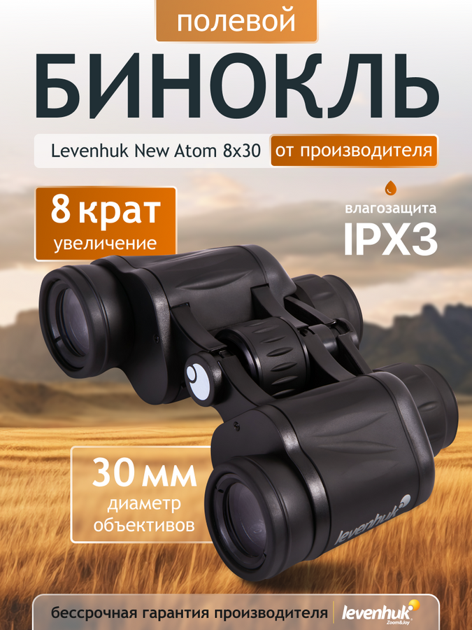 Binokulární dalekohled Levenhuk New Atom 8x30 poskytuje praktickou rovnováhu mezi zvětšením, zorným polem a schopností zaostřit na blízko. 30 mm objektivy a 8x zvětšení umožňují binokulárnímu dalekohledu zaostřit na objekt vzdálený od pozorovatele pouhých 6 metrů. Úhlové zorné pole je 7,5°, což znamená zorné pole 132 metrů na vzdálenost 1 km. To činí z tohoto dalekohledu všestranného a spolehlivého společníka pro pozorovatele ptáků, rybáře, lovce nebo turisty.
