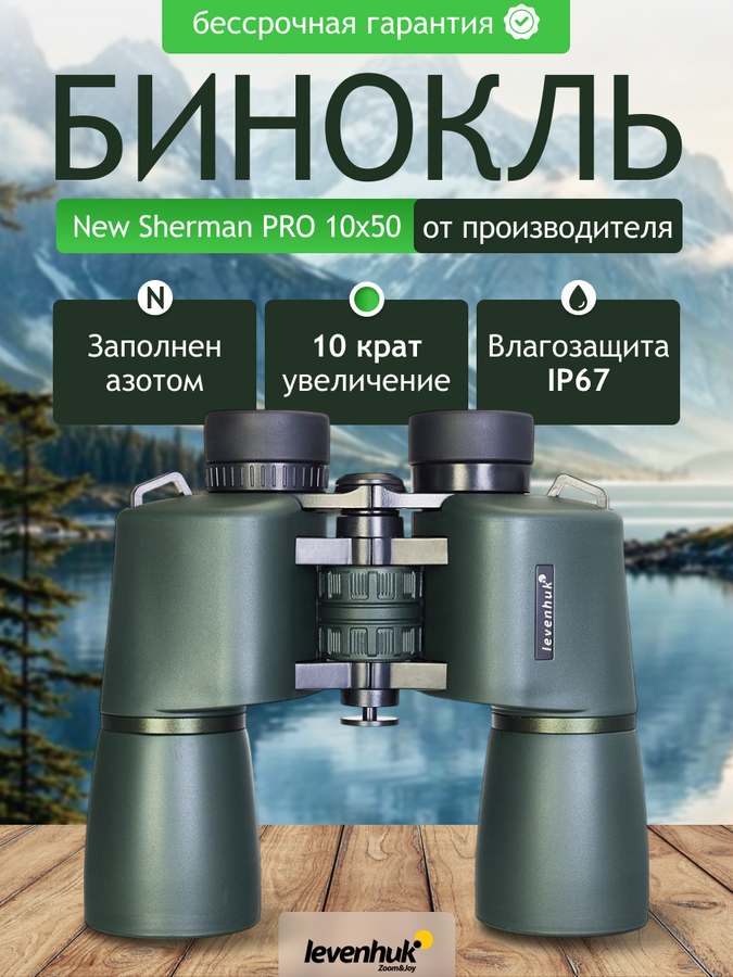 Levenhuk New Sherman PRO je řada binokulárních dalekohledů s porro hranoly s velkou aperturou. Jsou vybaveny vysoce kvalitní skleněnou optikou BaK-4 v mimořádně odolných duralových tělech, která jsou vhodná do každého počasí. Tento model s 10x zvětšením, 50 mm objektivem a vysokou relativní světelností je vynikajícím nástrojem pro pozorování ptáků, lov a turistiku. Díky svým optickým a praktickým vlastnostem je spolehlivou volbou i pro odborníky: geodety, topografy, pracovníky v energetice atd. Čočky a hranoly s vícenásobnou antireflexní vrstvou poskytují ostrý a barevně bohatý obraz. Zařízení se může pochlubit vysokým faktorem stmívání pro efektivní sledování nejen ve dne, ale i večer. Zorné pole je 114 metrů při 1 000 metrech.