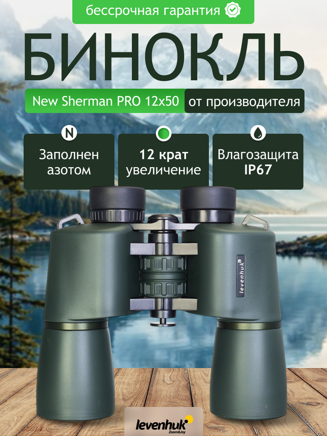 Společnost Levenhuk představuje řadu New Sherman PRO pro ty, kteří hledají spolehlivé binokulární dalekohledy profesionální kvality. Tento model s 12x zvětšením má optiku s velkou aperturou, která je vyrobena z prvotřídního skla BaK-4. Kombinace porro hranolů s vícenásobnou antireflexní vrstvou a čoček s vysokým indexem lomu zajišťuje vynikající viditelnost i za šera. Jasného, ostrého a detailního zobrazení bez vinětace lze snadno dosáhnout drobným nastavením zaostřovacího kolečka. Tento model doporučujeme vážným zájemcům o pozorování ptáků, lovcům a outdoorovým nadšencům.