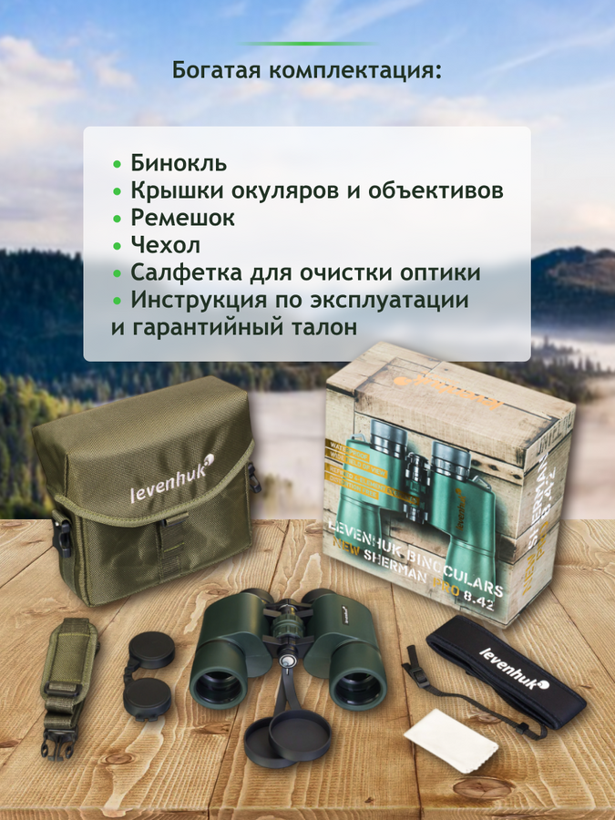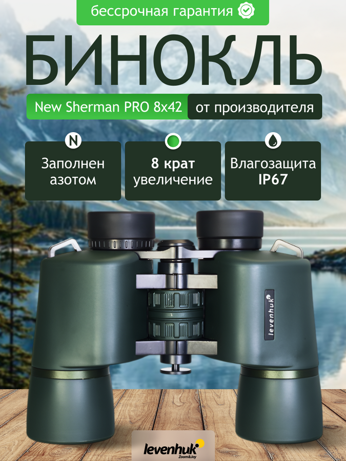 Binokulární dalekohled New Sherman PRO 8x42 je vynikající volbou pro lov, pozorování ptáků, sport a turistiku. Tento binokulární dalekohled je vybaven porro hranoly, má nejširší zorné pole v řadě (142 metrů při 1000 metrech) a optiku BaK-4 s vícenásobnou antireflexní vrstvou. Díky šestiprvkové optické konstrukci poskytuje binokulární dalekohled ostrý a kvalitní obraz v celém zorném poli s přirozenou reprodukcí barev a výjimečnými detaily. Díky optice sbírající světlo jsou vhodné pro denní i večerní použití. Faktor stmívání 18,33 zajišťuje dobrou viditelnost i za zhoršených světelných podmínek. Zaostření na vzdálenost 4 metrů umožňuje zaostřit jak vzdálené objekty, tak blízké detaily.