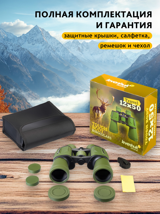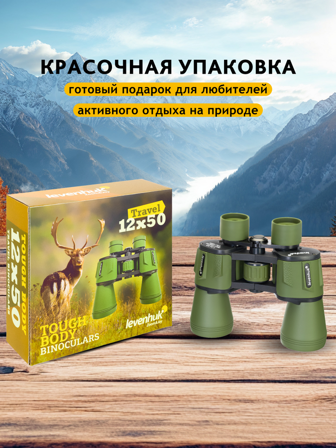 Čočky objektivu s velkou aperturou o průměru 50 mm shromažďují velké množství světla, a proto plně potažená optika založená na Porro hranolech poskytuje jasný, čistý a vysoce kontrastní obraz. Optické prvky jsou vyrobeny ze skla BK-7. Binokulární dalekohled Levenhuk Travel 12x50 poskytuje detailní pohled na vzdálené objekty i za svítání nebo za soumraku. Sestavení binokulárního dalekohledu je snadné. K nastavení ostrosti obrazu se používá centrální zaostřovací kolečko. Očnice lze sklopit nebo rozložit a upravit dioptrie a mezipupilární vzdálenost.