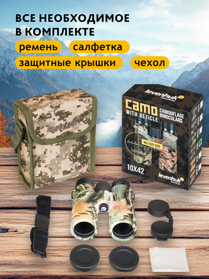 Binokulární dalekohled se zaměřovačem Levenhuk Camo 10x42 je optická přístroj pro lovce, rybáře, turisty a všechny příznivce aktivního životního stylu. Tento model má vše, co může polní binokulární dalekohled nabídnout – výkonné 10x zvětšení, klasické 42mm objektivy, vodotěsné a vysoce odolné tělo v maskovacím provedení. Jeden z okulárů má navíc rastrový záměrný kříž a měřítko pro měření vzdálenosti, které umožňuje vypočítat vzdálenost k cíli, určit jeho výšku a změřit horizontální a úhel náměru. Skvělá volba pro lov!