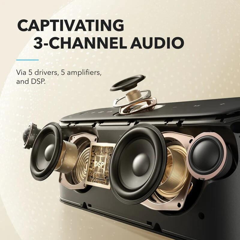 Spatial Audio a mobilní aplikace s ekvalizérem: jedná se o integrovaný čip, který zajistí nejen kvalitní stereo zážitek, ale zejména konverzi na tříkanálové audio pro pocit poslechu na úrovní domácího kina. Bezdrátové Bluetooth připojení Vám poslouží k propojení se smartphonem, jakož i mobilní aplikací Soundcore. Ta nabízí také profesionální ekvalizér s možností přizpůsobení zvuku podle tvých potřeb.