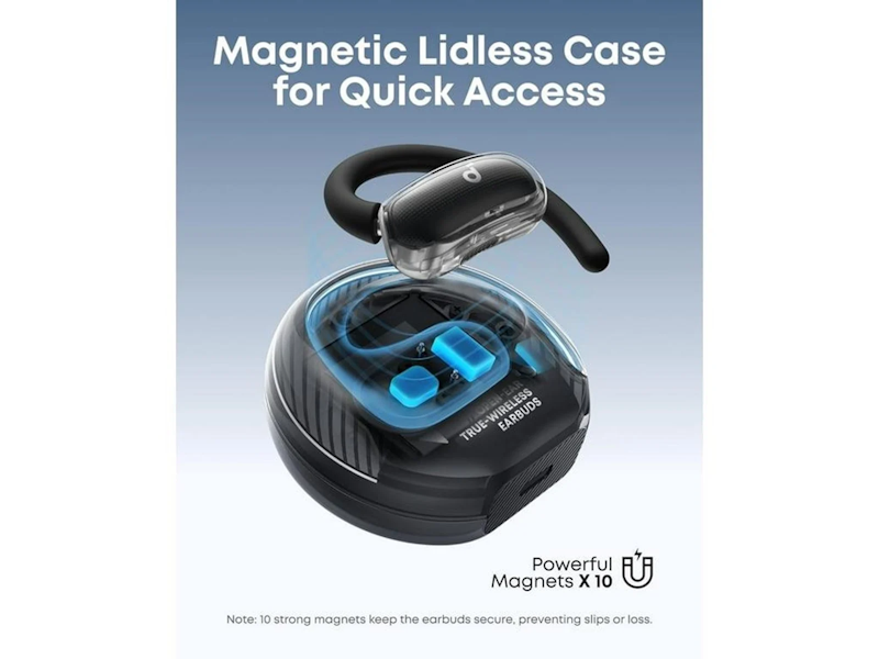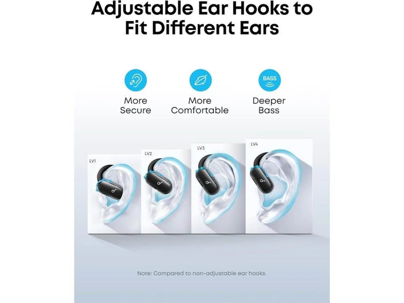 Perfektně padnou do každého ucha: Inovativní čtyřúrovňově nastavitelné ušní háčky Soundcore zajišťují pohodlné nošení přizpůsobené více než 99 % tvarů a velikostí uší.