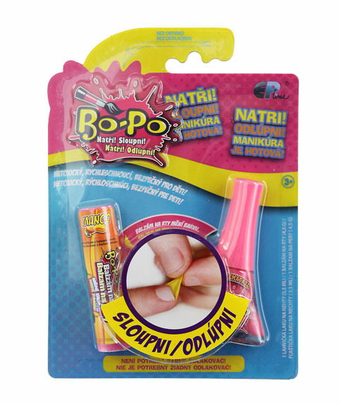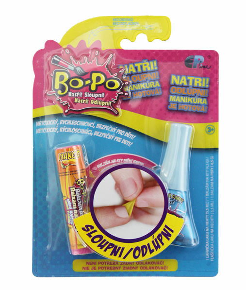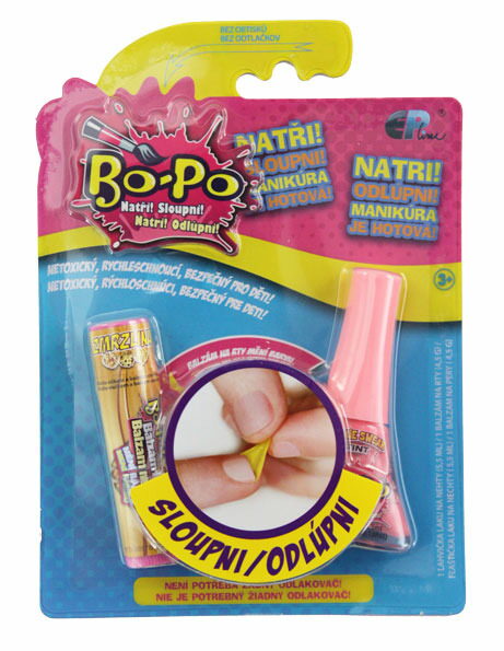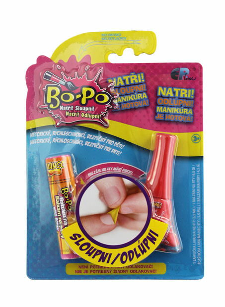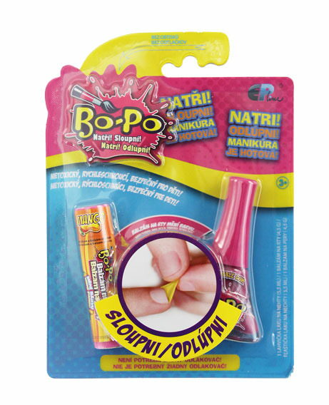 Užijte si krásné nehty se slupovacími laky Bo-Po. Je to vážně jednoché. Už žádný odlakovač. Naneste lak, nechte ho zaschnout. Chcete si užít novou barvu? Lak jednoduše sloupněte. Pozor! Tato sada obsahuje jeden lak, ale také balzám na rty, který mění barvu. Obsahuje: 1 Bo-Po lak a 1 balzám na rty (Zmrzlina nebo Mango)