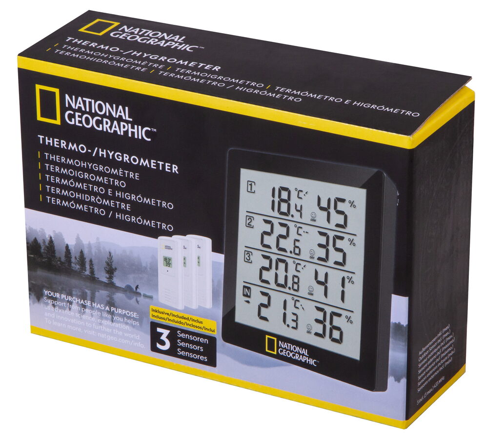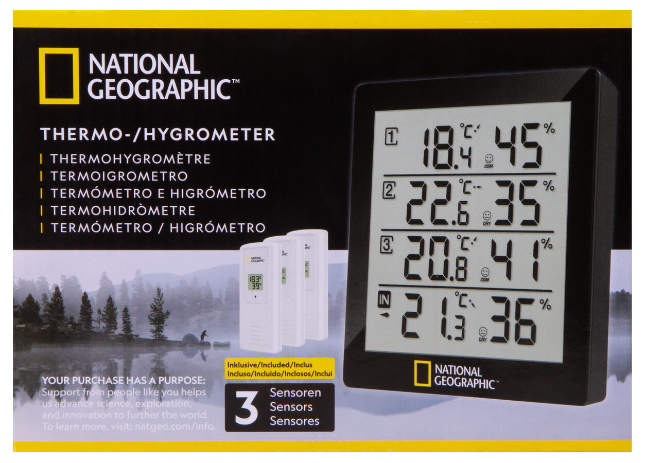 The National Geographic thermo-hygrometer offers the possibility to measure temperature and air humidity in or around your house at 4 different locations, with simple monitoring at one location: Is my cellar room too moist and threatened by mould? Is the children's bedroom temperature all well? Is it too hot on the terrace? There are many more options open.