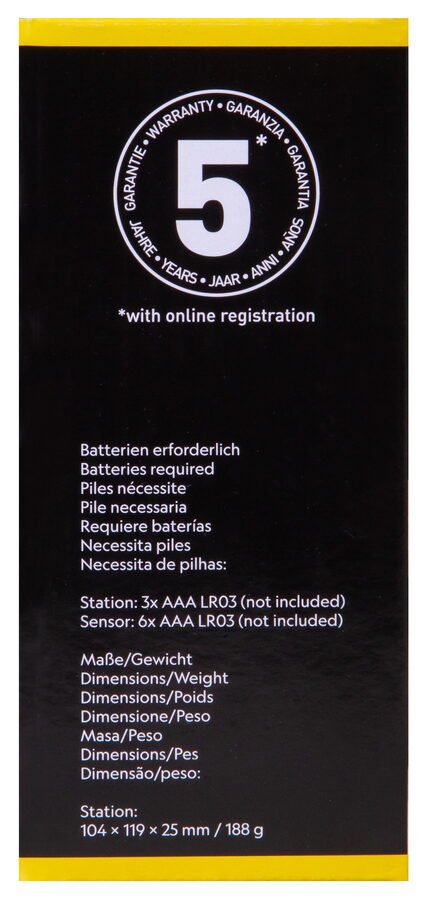 Battery powered by 3x AAA / LR03 batteries (mainstation) and 6x AAA / LR03 batteries (for the three sensors).