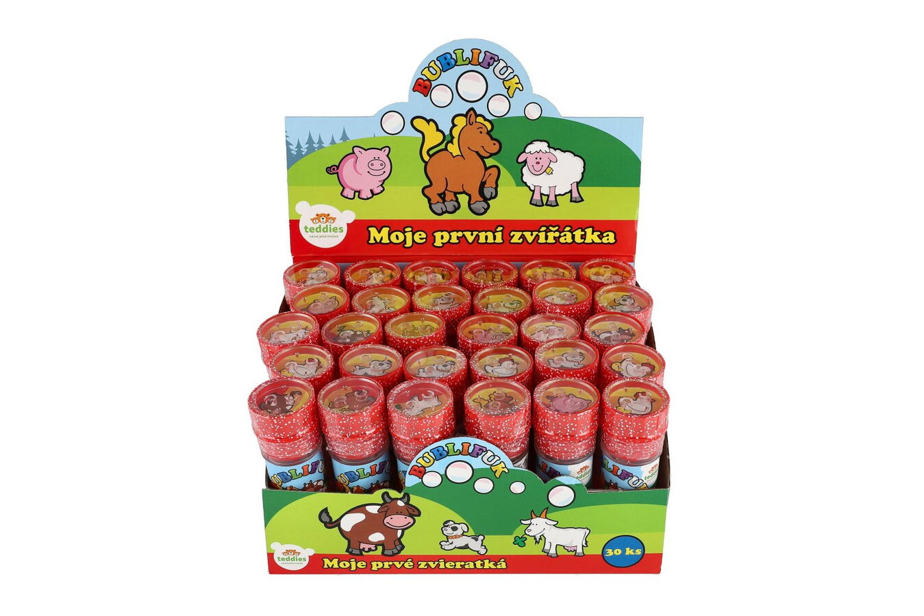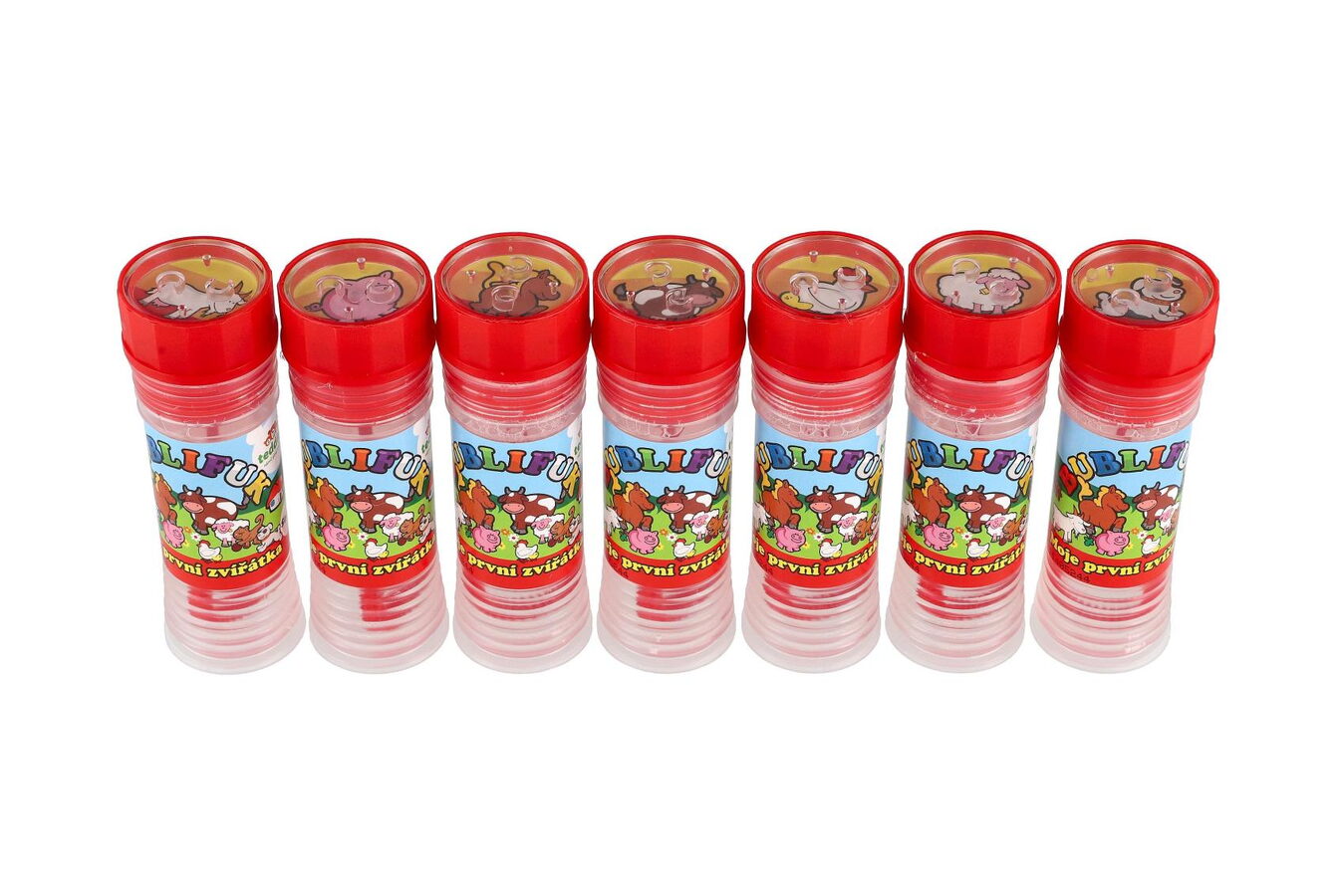 Bublifuk s ovocnou vůní a motivem zvířátek na obalu. Bublifuk má bezpečný uzávěr a jednoduchou hru ve víčku, foukátko je součástí víčka.