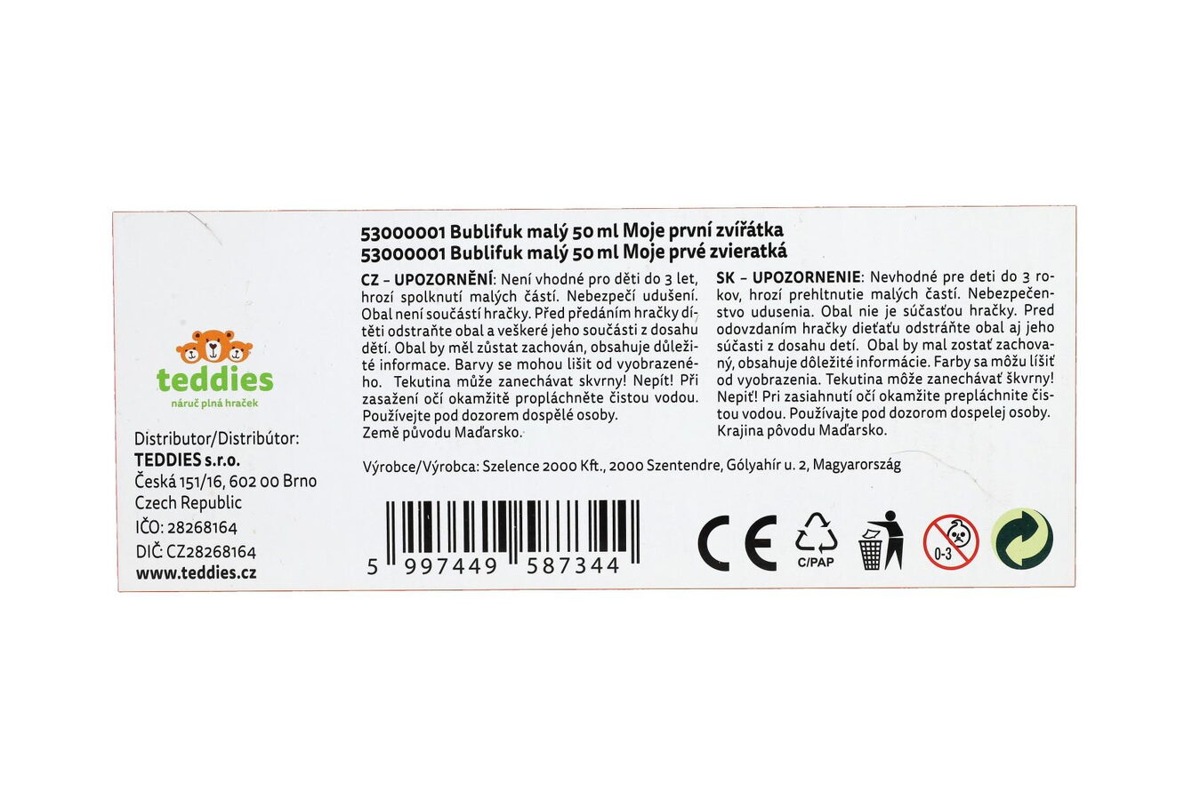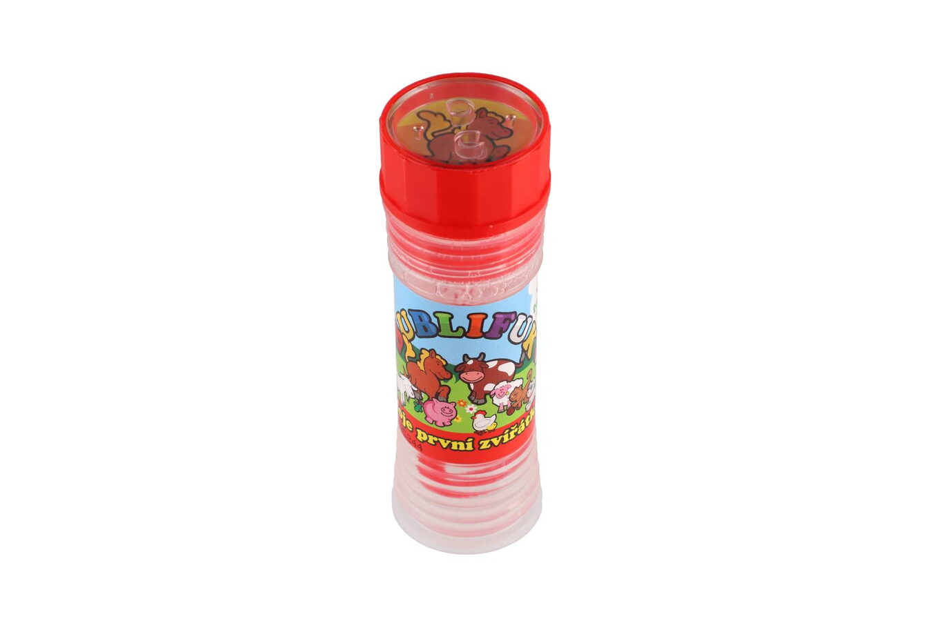 Cena je za jeden kus. Bublifuk s ovocnou vůní a motivem zvířátek na obalu. Bublifuk má bezpečný uzávěr a jednoduchou hru ve víčku, foukátko je součástí víčka.