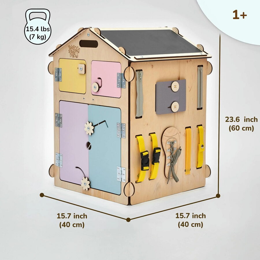 Hrací domeček BusyKids je Montessori hračka ideální pro každé dítě. Pedagogika Montessori podporuje učení dětí zábavným a přirozeným způsobem, rozvíjí jejich kreativitu, jemnou motoriku a logické myšlení. Pokud hledáte kvalitní hračku pro batole, která je bude bavit dlouhé roky, stane se jeho společníkem a později ji využijí i sourozenci, pak je hrací domeček BusyKids House tou ideální volbou.Domeček je vhodný pro děti všech věkových kategorií. Batolata se ráda schovávají do domečku a objevují jeho prostor, předškoláci trénují jemnou motoriku, koordinaci ruka-oko a učí se například zavazování tkaniček. Dospělí ocení, že mají doma ekologickou alternativu k plastovým hračkám, která vydrží i pro další generace.Hrací domeček nabízí širokou škálu aktivit. Na střeše najdete tabuli a vkládací puzzle, na stěnách jsou zipy, suchý zip, dotyková lampa, budík, motorické prvky, tlačítka, okna a dveře. Otevírání, zavírání a vhazování hraček dovnitř i ven děti nesmírně baví. Díky interaktivním prvkům domeček podporuje rozvoj kreativity, smyslového vnímání, logického myšlení a jemné motoriky. Děti si trénují koordinaci oko–ruka, soustředění a trpělivost při složitějších aktivitách, jako je zapínání knoflíků a tlačítek.Každý kus domečku prochází pečlivou ruční výrobou. Díly jsou vyrobeny z kvalitní březové překližky, laserově řezané hrany jsou hladké a bezpečné pro děti. Použité laky na vodní bázi jsou zdravotně nezávadné a konstrukce je bez šroubů, všechny prvky jsou nýtované. Domeček je certifikován dle CE, 2009/48/ES a norem EN 71-1, 71-2, 71-3, 71-8 a 71-9.Barevné odchylky, uzly či drobné opravy dřeva jsou přirozené a dodávají domečku jedinečný charakter. Produkt lze složit z šesti panelů, takže je vhodný i do menších prostor. Hlavní vlastnosti: inspirace Montessori pedagogikouobsahuje interaktivní prvky jako zipy, suchý zip, tlačítka, budík, puzzle, tabulerozvíjí jemnou motoriku, kreativitu a logické myšlenívyrobeno z kvalitní březové překližky, bezpečné laky na vodní bázikonstrukce bez šroubů, díly nýtovanéideální pro batolata i předškolákysplňuje certifikace bezpečnosti CE a normy EN 71vyrobeno v České republice