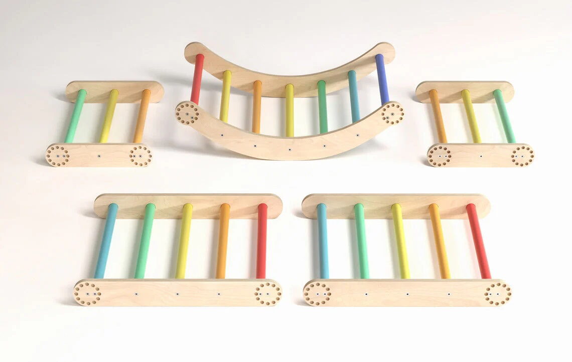 Mít vlastní herní park přímo doma to je sen každého dítěte. A co teprve žebřinovou horolezeckou stěnu s hrazdou na konci! Tato velká lezecká stěna je vhodná pro menší děti i pro ty, které už rády zdolávají výšky. Žebřiny se skládají ze třech prvků. Dvou trojúhelníků a jednoho balančního oblouku. Velký trojúhelník má rozměry 51,5 x 63,5 x 66 cm (výška × hloubka × šířka), malý trojúhelník 31,5 × 63,5 × 43,5 cm (výška × hloubka × šířka) a balanční oblouk je o rozměrech 21 × 63,5 × 75 cm (výška × hloubka × šířka). Tato velká lezecká sada pro děti kombinuje 2 trojúhelníky a malou houpací desku s možností upevnění na stěnu. Sestavu je možné použít na zemi k plazení, stání, lezení a ke zkoušení různých variací hry dle věku a dovedností a speciální stěnové upevnění pak transformuje tento modul na skutečnou horolezeckou stěnu, která je ideální pro rozvoj motorických dovedností. Díky variabilnímu designu bude tato sada růst spolu s dítětem, od plazení a lezení až po náročnější horolezecké výzvy.Produkt je vyroben z kvalitní březové překližky, barevné odchylky, suky či drobné opravy ve dřevě jsou přirozené a dodávají výrobku jedinečný charakter.Sadu je možné doplnit také o BKCT01A01 Odnímatelnou desku, díky které je možné vytvořit na žebřinách stoleček. Hlavní vlastnosti: multifunkční využitínosnost 100 kgvzdálenost mezi příčkami je 8,5 cmtrénuje motoriku a rovnováhuskvělý doplněk do dětského pokoje či herny