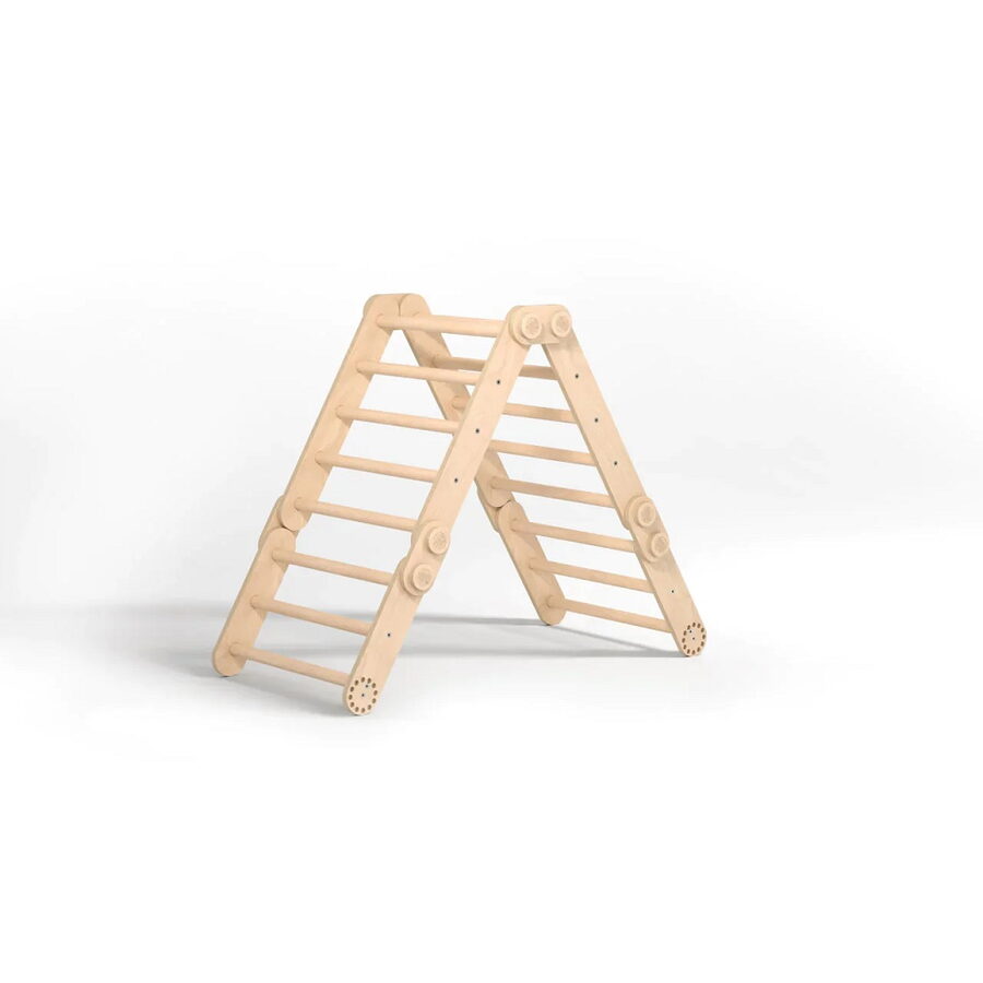 Mít vlastní herní park přímo doma to je sen každého dítěte. Tato malá lezecká sada nabízí mnoho variant sestavení, které snadno změníte bez použití nářadí. Je vhodná pro menší děti i pro ty, které už rády zdolávají výšky. Sestava se skládá ze dvou trojúhelníku. Velký trojúhelník má rozměry 51,5 x 63,5 x 66 cm (výška × hloubka × šířka) a malý trojúhelník je o rozměrech 31,5 × 63,5 × 43,5 cm (výška × hloubka × šířka). Produkt je vyroben z kvalitní březové překližky; barevné odchylky, suky či drobné opravy ve dřevě jsou přirozené a dodávají výrobku jedinečný charakter. Hlavní vlastnosti: multifunkční využitínosnost 80 kgvzdálenost mezi příčkami je 8,5 cmtrénuje motoriku a rovnováhuskvělý doplněk do dětského pokoje či herny