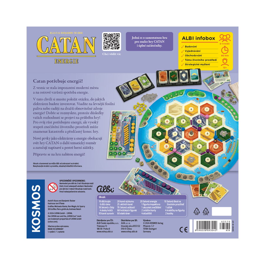 Připravte se na hru nabitou energií! Nové prvky jako elektrárny a energie obohacují svět hry Catan o další tematický rozměr. Jedná se o samostatně hratelnou hru, zároveň ji nelze kombinovat s jinými Catan produkty. Hra Catan - Energie obsahuje: 19 dílů krajin, 6 dílů rámu, 18 žetonů s čísly, 4 desky hráčů, 95 karet surovin, 20 karet výzkumu, 25 akčních karet, 79 žetonů událostí, 88 hráčských figurek, 60 elektráren, 20 žetonů energie, 1 figurka inspektora, 1 ukazatel znečištění, 2 zvláštní karty, 4 skladiště, 10 žetonů škod na životním prostředí, 1 sáček, 4 krabičky na figurky, 2 kostky