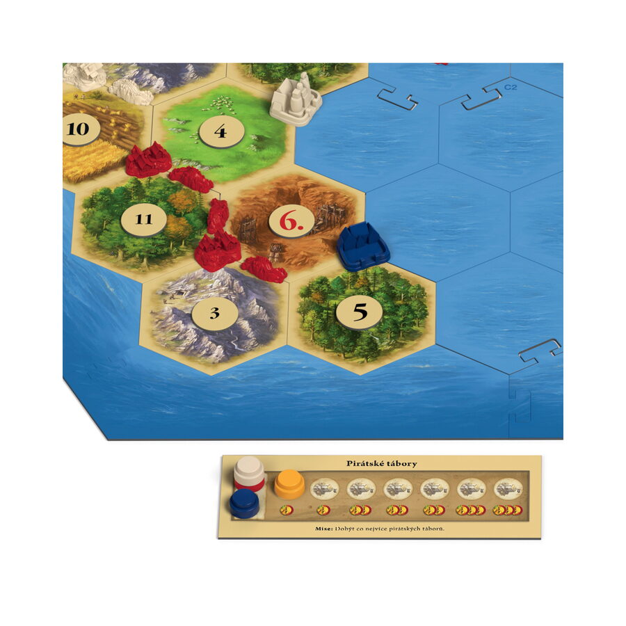Rozšíření hry Catan, ve kterém hráči objevují ostrovy, zakládají vesnice, dobývají pirátské tábory, loví ryby a obchodují s kořením. Hru nelze hrát samostatně a je potřeba vlastnit základní hru Catan - Osadníci z Katanu. Rozšíření obsahuje: 24 dílů pevniny, 11 dílů moře, 14 dílů rámu, 12 žetonů s čísly, 6 pirátských táborů, 3 stupnice misí, 3 destičky mimořádných bodů, 76 mincí, 88 hráčských figurek, 6 figurek rybích hejn, 24 figurek pytlů koření, 4 přehledy stavebních nákladů a pravidla hry v češtině a slovenštině.