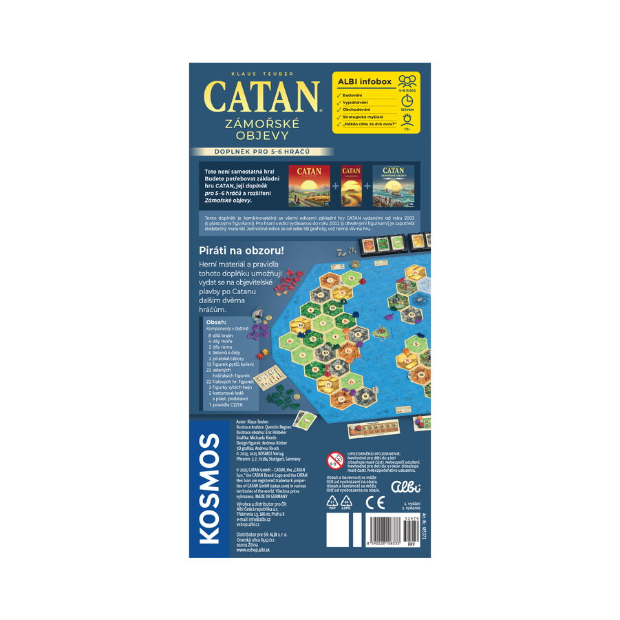 Rozšíření pro hru Catan - Zámořské objevy, které umožňuje hraní pro další dva hráče. Hra obsahuje: 8 dílů krajin, 4 díly moře, 2 díly rámu, 6 žetonů s čísly, 2 pirátské tábory, 12 figurek pytlů s kořením, 22 zelených hráčských figurek, 22 fialových hráčských figurek, 2 figurky rybích hejn, 2 kartonové lodě s plastovými podstavci a pravidla hry v češtině a slovenštině.