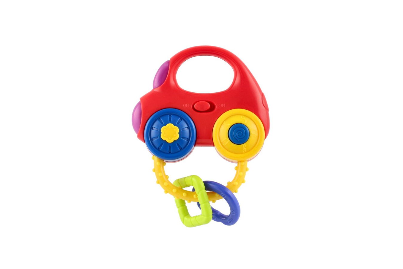 Barevné dětské chrastítko ve tvaru auta se díky svým veselým barvám stane velmi oblíbeným u nejmenších. Chrastítko po zmáčknutí tlačítek bliká, hraje melodie a vydává zvuky startujícího, jedoucího či troubícího auta.