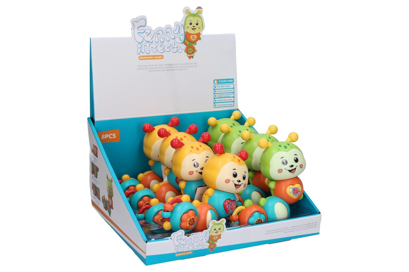 Chrastítko housenka s efekty plast 14cm na baterie se zvukem 2 barvy 8ks v boxu