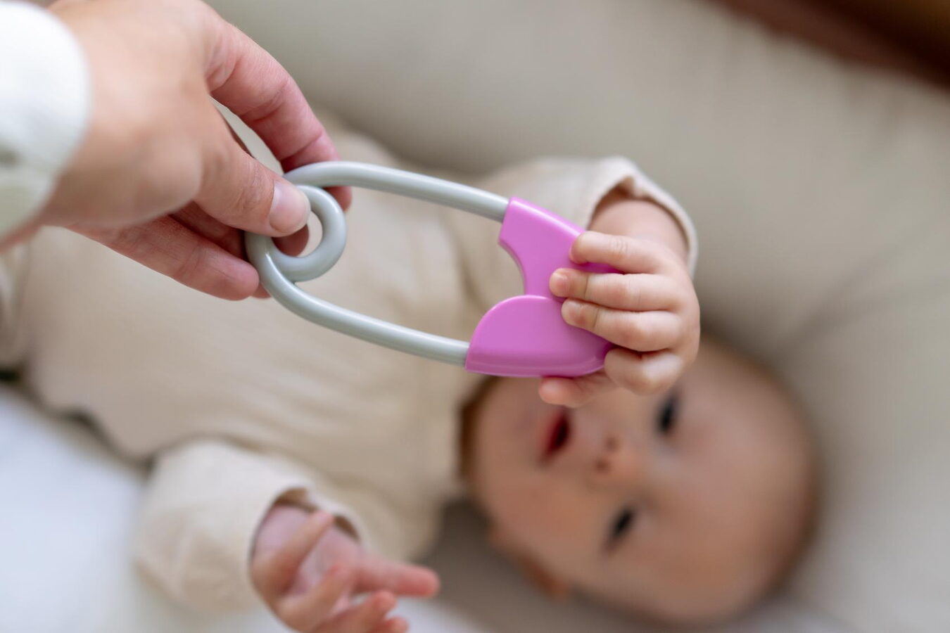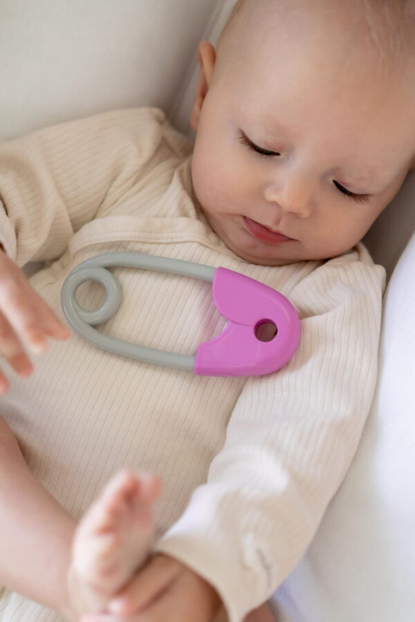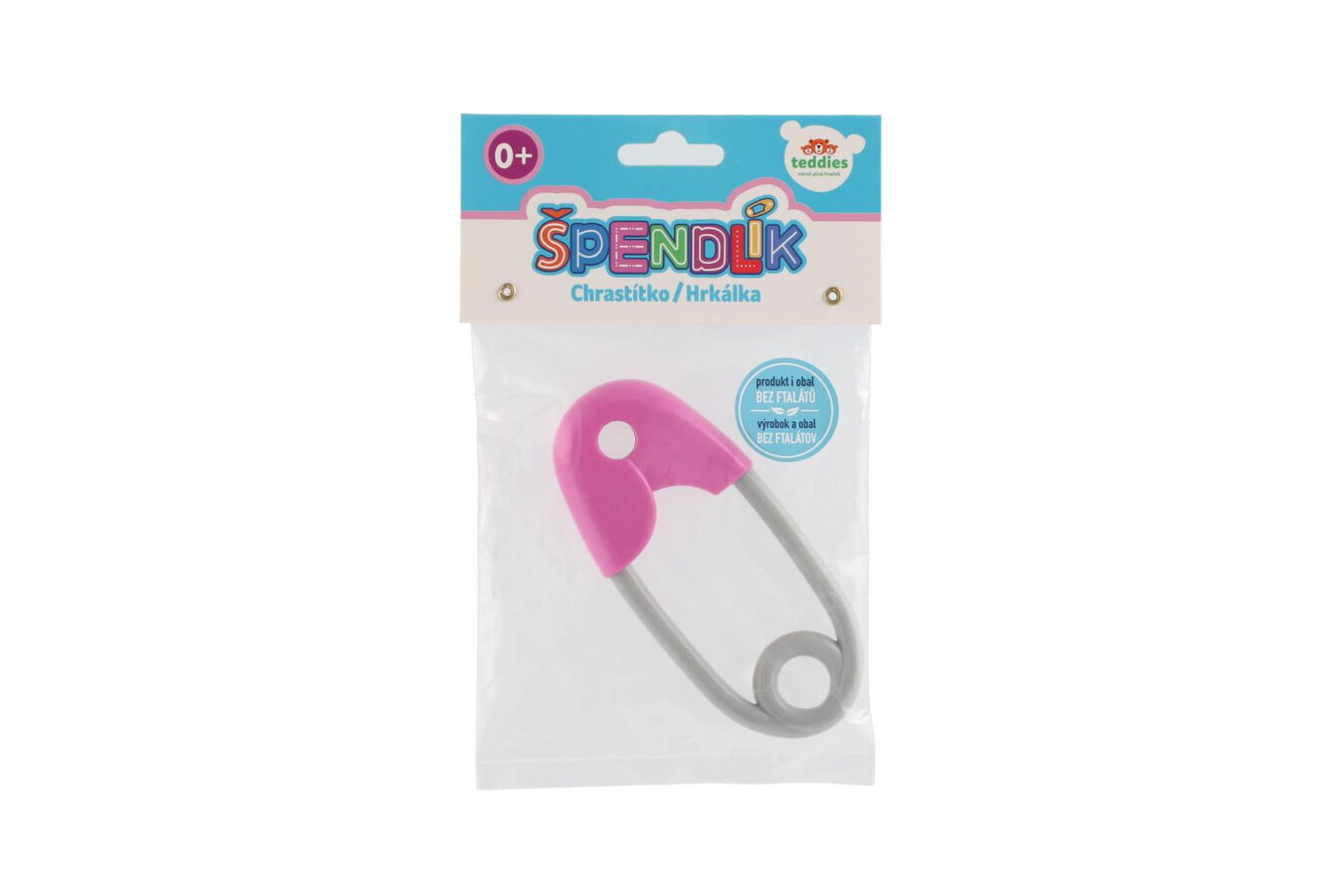 Chrastítko špendlík plast 12cm růžovošedé 12x19cm v sáčku 0+
