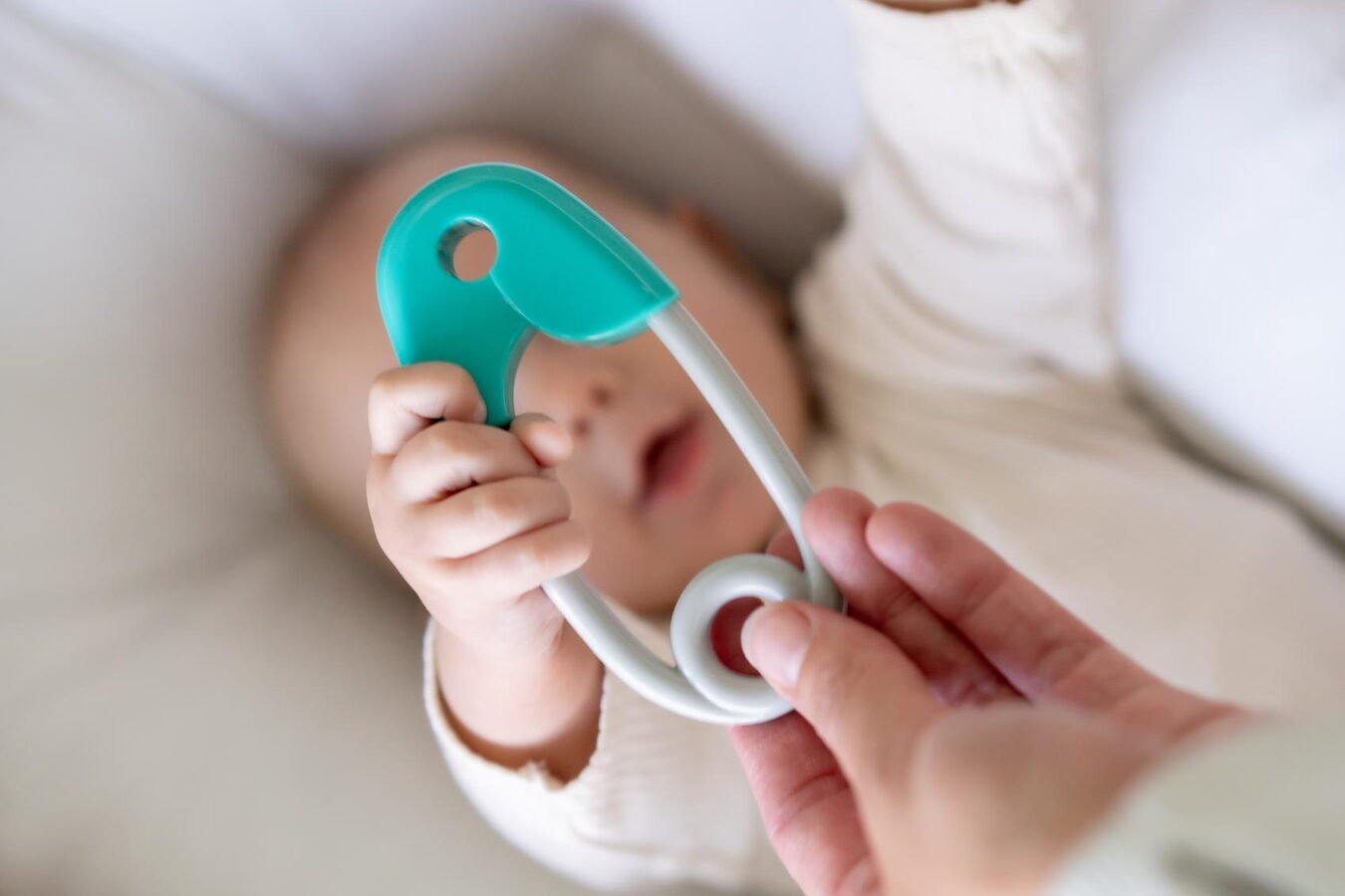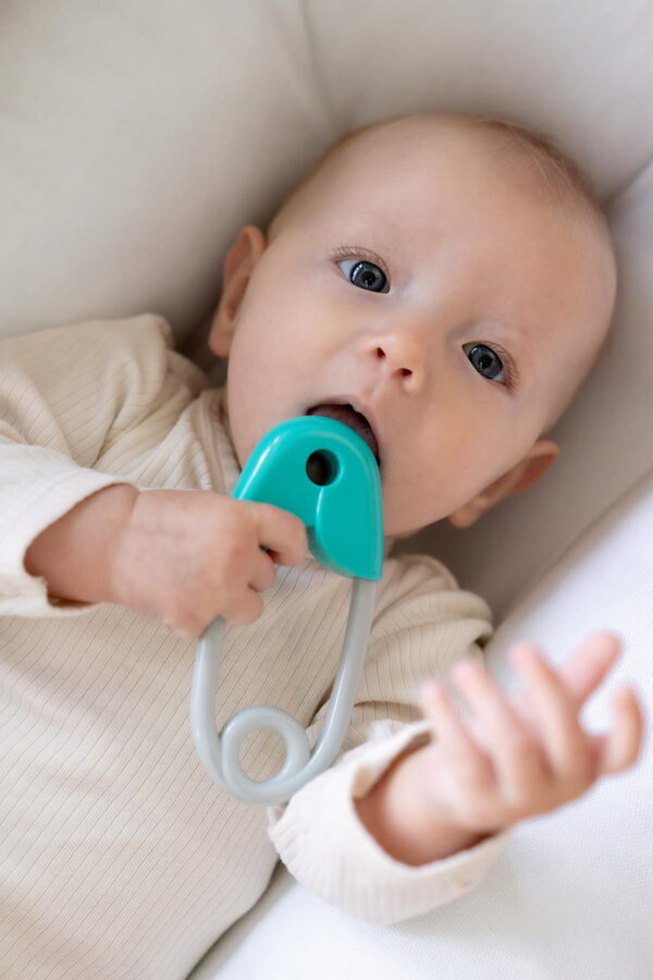 Chrastítko špendlík plast 12cm tyrkysovošedé 12x19cm v sáčku 0+