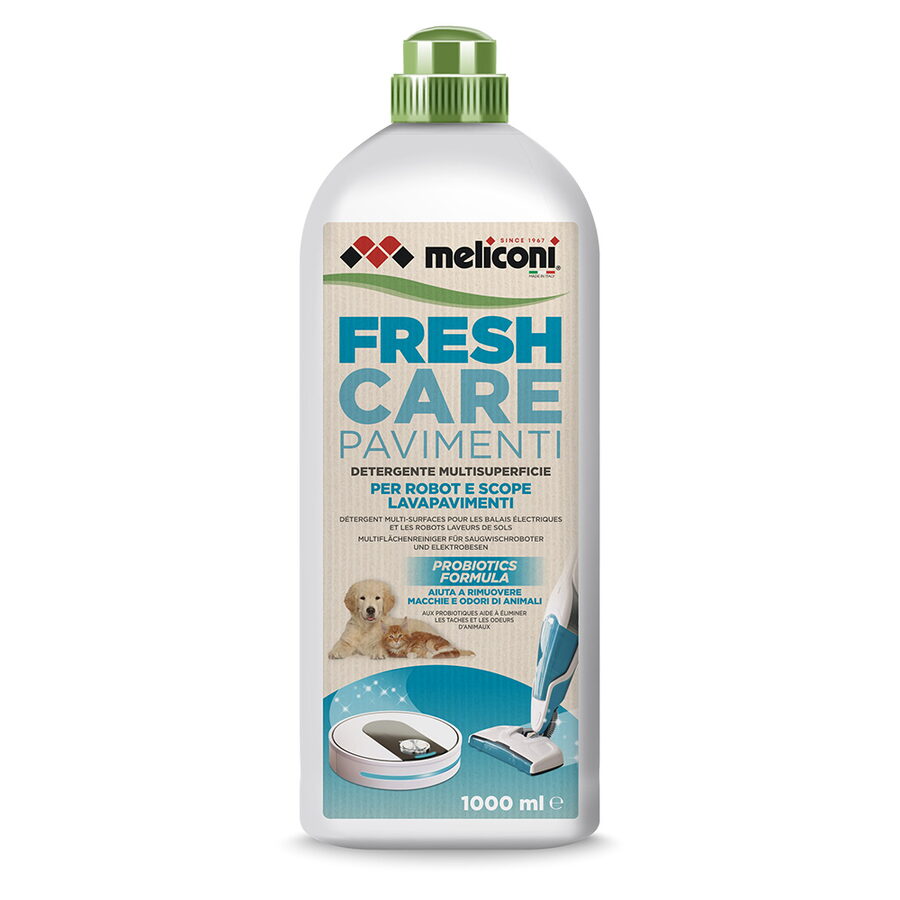 Tekutý čistič FRESH CARE s probiotiky značky Meliconi v balení 1000 ml. Nová hranice inteligentního čištění určený pro robotické vysavače a mopy vyroben z čistě ekologických přírodních látek, bez fosfátů. Přítomnost aktivních probiotik umožňuje hloubkové čištění, odstraňuje odolné skvrny a pachy domácích mazlíčků a zanechává domov vždy svěží, příjemný a zdravý. Je to ideální řešení pro ty, kteří hledají přírodní čištění bez kompromisů ve výkonu. Tento přírodní produkt se získává z rostlinných surovin a nezanechává zátěž pro životní prostředí.