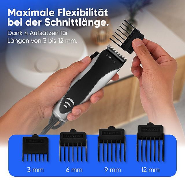 Set zastřihovače a odstraňovače chloupků s řadou příslušenství je vhodný pro každého muže. Zastřihovač díky hlavě z nerezové oceli umožňuje přesný a jednotný střih. Dlouhou životnost zajišťuje kvalitní výkonný motor. Čepel je vyrobena také z nerezové oceli. Součástí balení jsou 4 hřebenové nástavce o délkách 3, 6, 9, a 12 mm, které je možné použít a nastavit tak požadovanou délku. Zastřihovač je vybaven poutkem pro zavěšení. V balení je dále čisticí kartáč a ochranný kryt. Napájení je 220-240 V, 50/60 Hz.