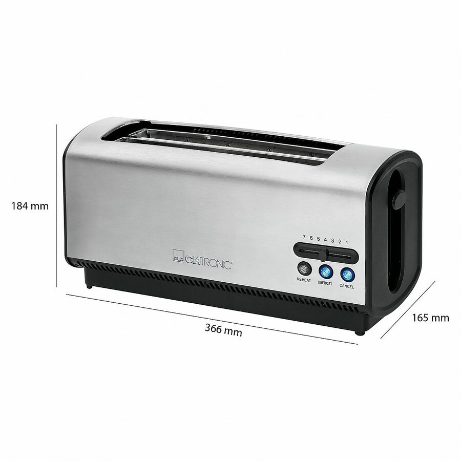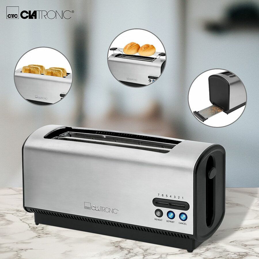 Toaster TA 3687 od značky Clatronic je vybaven pouzdrem z nerezové oceli. Disponuje funkcí ohřevu a rozmrazení. Tlačítka na přední straně jsou modře podsvícena. Termostat lze plynule nastavit. Toaster je vybaven centrovací funkcí, a tím je zajištěno rovnoměrné opečení z obou stran. Vypnout lze manuálně nebo automaticky. Ve spodní části se nachází nádoba pro sběr drobků. Je zde také prostor pro uložení kabelu. Napájení je 220-240 V, 50/60 Hz. Maximální výkon je 1200 W.