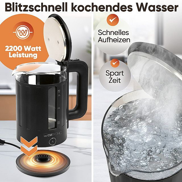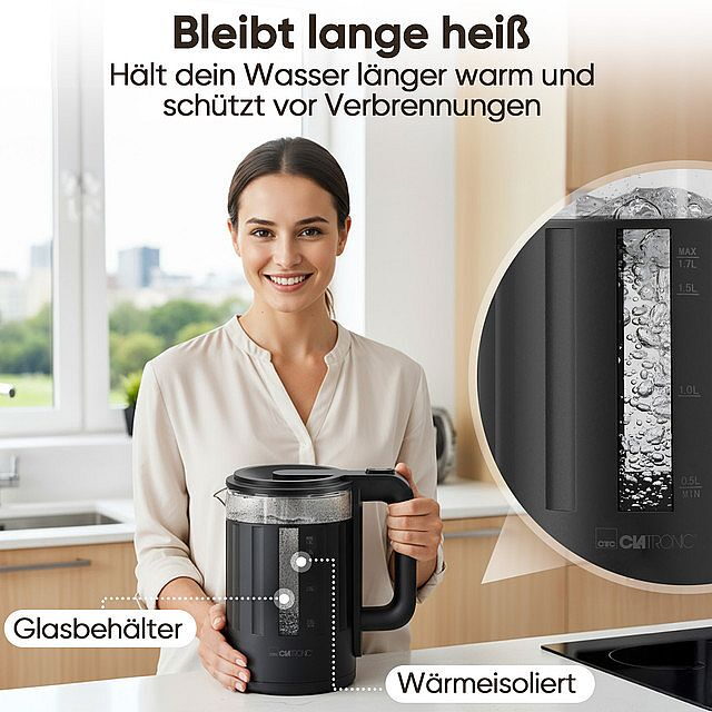 Stylová skleněná rychlovarná konvice Clatronic WK 3837 G kombinuje moderní design, bezpečnost a praktičnost. Díky objemu až 1,7 litru připravíš snadno vodu pro celou rodinu nebo návštěvu. Tepelně izolovaná skleněná nádoba zaručuje bezpečné používání a udržuje vodu déle teplou, zatímco skrytý nerezový topný prvek chrání konvici před vodním kamenem a prodlužuje její životnost.