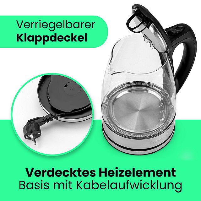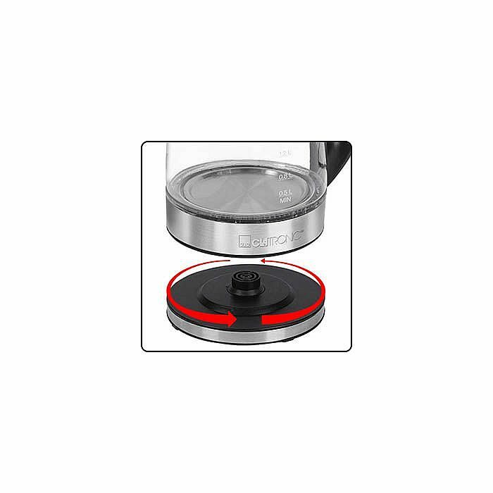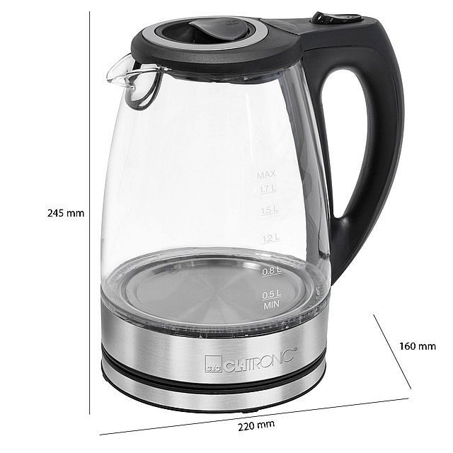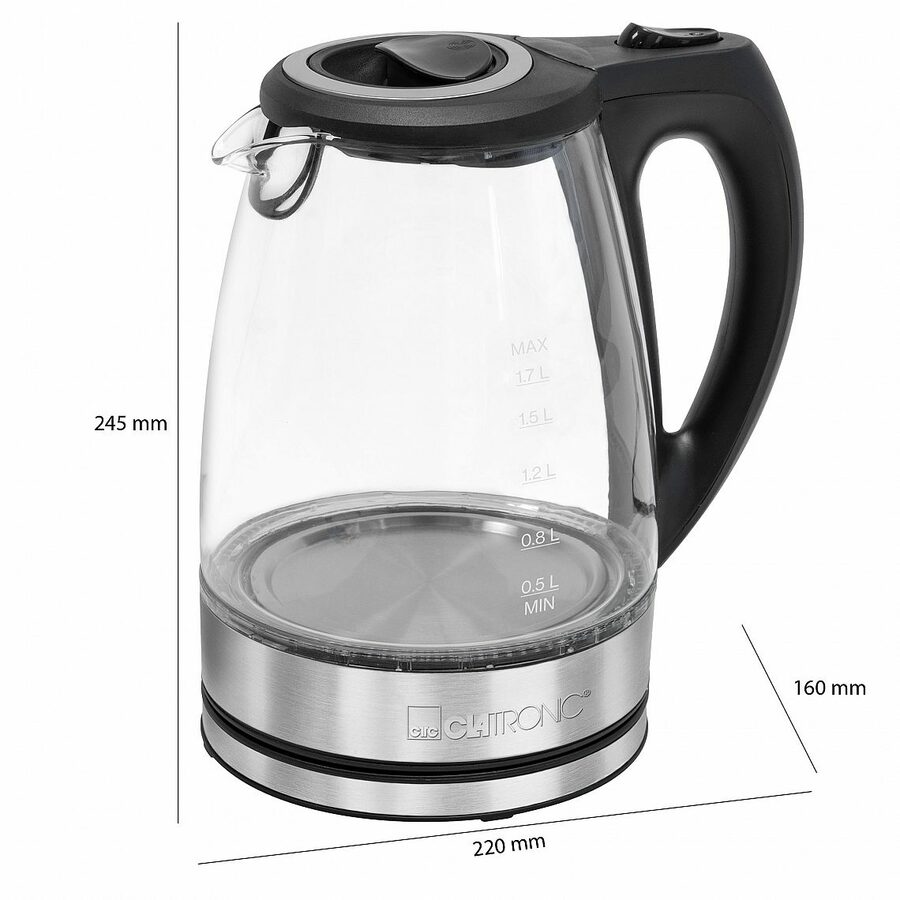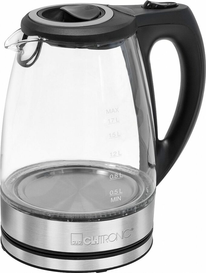 Rychlovarná konvice od značky Clatronic s kapacitou až 1,7 litru je vyrobena ze žáruvzdorného skla a nerezové oceli. Její víko je vybaveno uzamykatelným bezpečnostním systémem. Pro zapnutí/vypnutí slouží přepínač na rukojeti, ovládání je proto jednoduché. Po dosažení 100 °C se však konvice vypne automaticky. Topný článek je skrytý a vyrobený z nerezové oceli. Základní stanice je nerezová a umožňuje ukrytí napájecího kabelu. Rychlovarná konvice disponuje ochranou proti přehřátí a odpařování. Napájení je 220-240 V, 50 Hz a výkon 2 200 W.