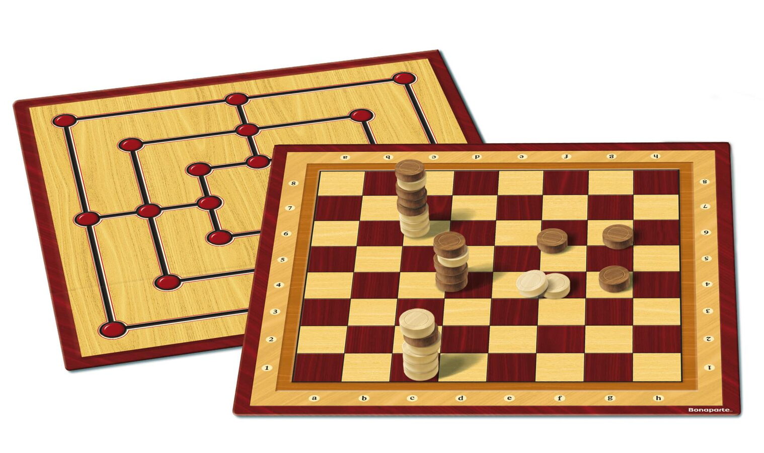 Mlýn - tato hra začíná prázdnou hrací deskou a je určena pro 2 hráče. Hráči se ve svých tazích střídají, jako vždy začíná ten hráč, který má bílé kameny. V první fázi hry, hráč položí svůj kámen na libovolné pole. Za "mlýn" jsou považovány tři kameny jedné barvy ležící na jedné linii. Hráč, který položil ke svým dvěma kamenům třetí a dokončil tak mlýn, smí odstranit z hrací desky jeden soupeřův kámen. Nesmí to však být kámen ze soupeřova uzavřeného mlýna. Když oba hráči dokončí kladení kamenů na desku, začíná druhá fáze hry. Hráč posune svůj kámen na sousední volné pole, skákání přes jiné kameny není dovoleno. Když je dokončen mlýn, může se soupeři odebrat libovolný kámen, který není právě součástí jeho mlýna. V případě, že všechny soupeřovi kameny tvoří mlýn, odebere kterýkoli kámen tvořící mlýn. Hráči mohou kdykoli odsunout z mlýna kámen a v příštím tahu jej vrátit na původní místo. Za nové uzavření mlýna získávají právo na odstranění dalšího soupeřova kamene.