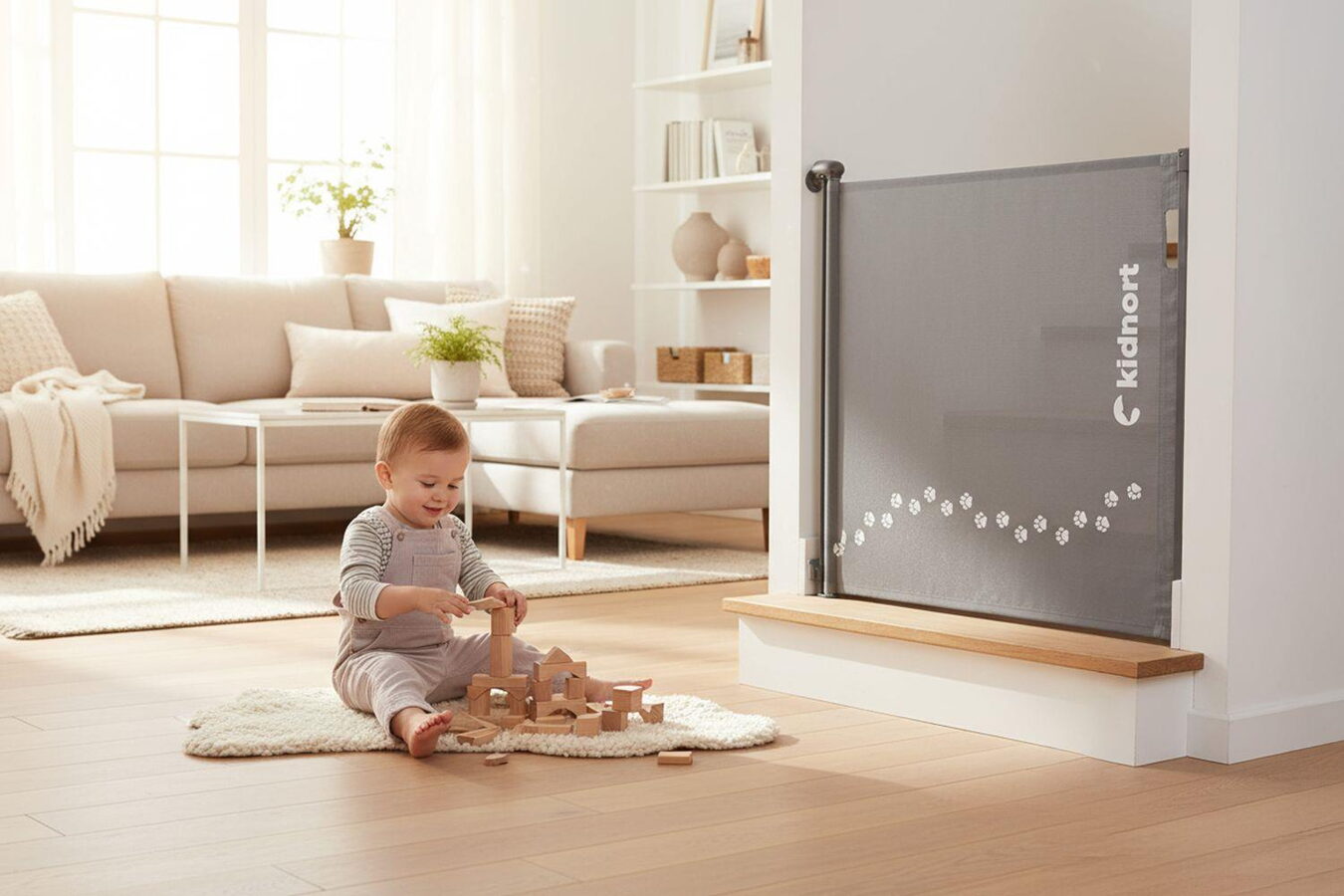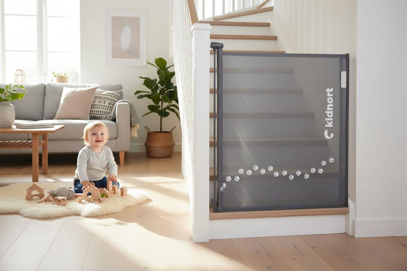 Zábrana funguje jako rolovací roleta – pomocí integrované rukojeti ji rychle a plynule rozvinete přes prostor, který chcete zabezpečit. Intuitivní mechanismus zaručuje snadné každodenní používání. Rodiče ji bez námahy otevřou i zavřou, zatímco dětská pojistka zabrání malým průzkumníkům v samostatném otevření. Tichý a plynulý chod je ideální pro domácnosti s malými dětmi.