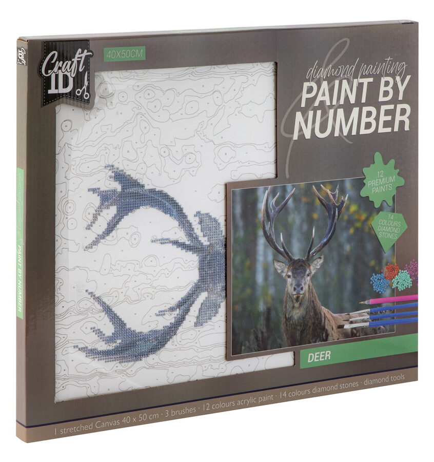 Malování pomocí kamínků Diamond/podle čísel Jelen 40×50 cm. Tento obrázek kombinuje dvě techniky pomocí kamínků a malování podle čísel. Součástí balení vodové barvy, štetec, aplikátor, kamínky a obrázek.