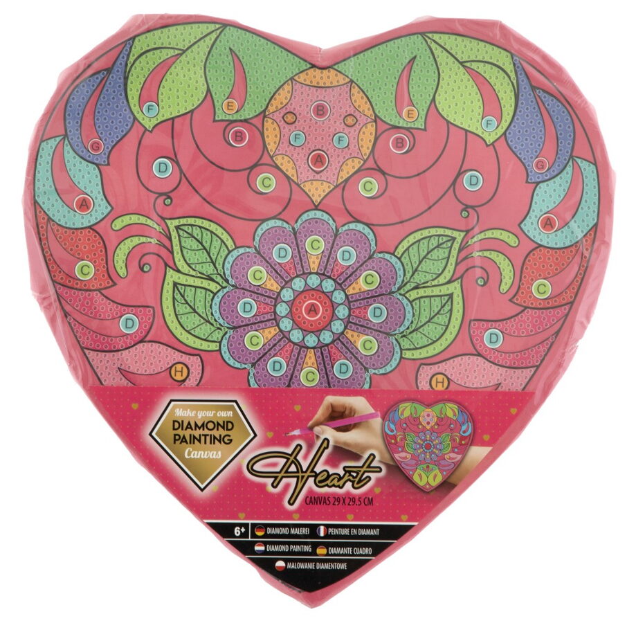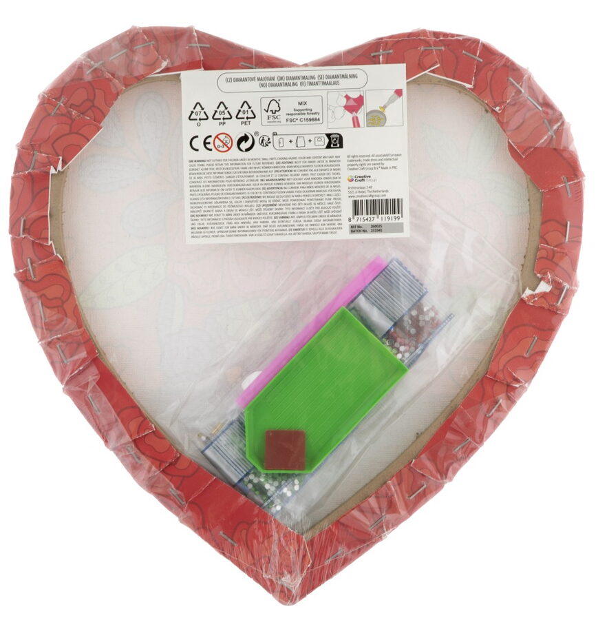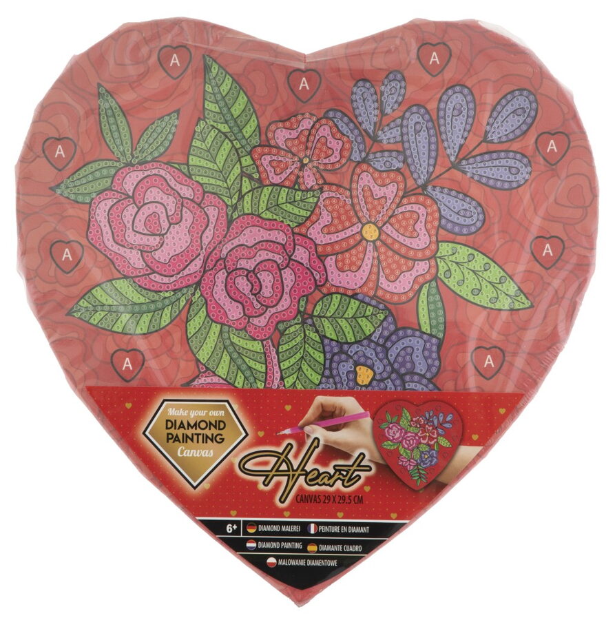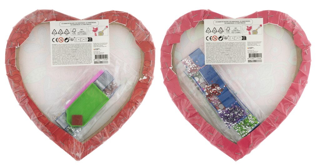 Diamantové malování Srdce – velkost obrázku 29×29,5 cm. Balení obsahuje šablonu srdce, různobarevné kamínky,mističku a aplikátor. Dvě různá provedení.