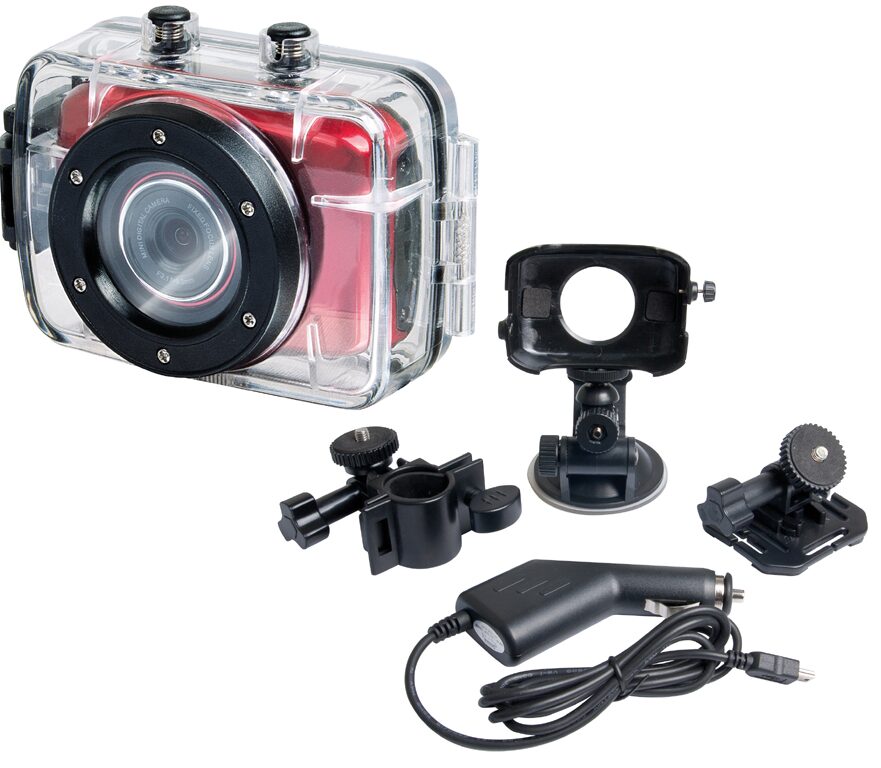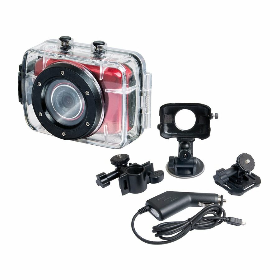 Digitální kamera Trevi GO 2200 RED, vodotěsná do hloubky 3m, prachuodolná a mrazuvzdorná, videosekvence pořizuje v HD kvalitě a fotografie v 5Mpix, LCD má dotykový o velikosti 2", v balení naleznete vodotěsné pouzdro, nabíječku do auta a další příslušenství.