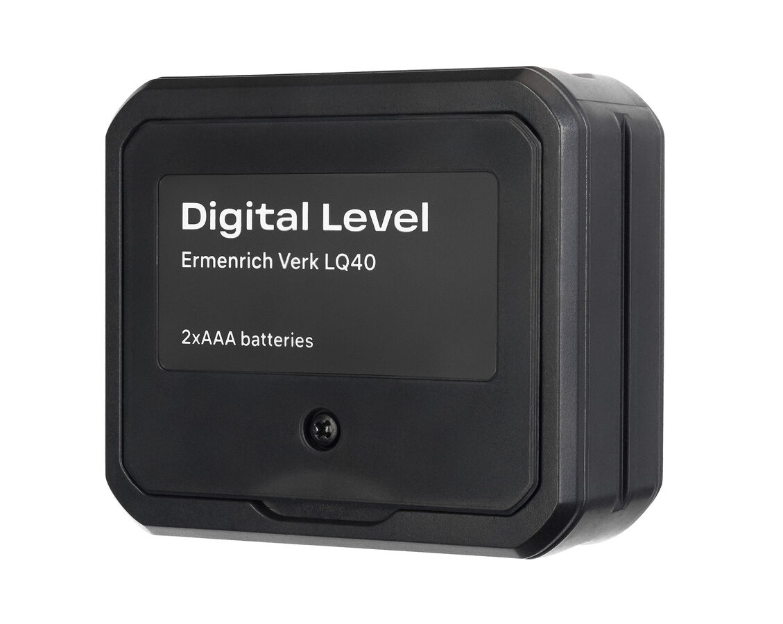 Naměřené hodnoty se zobrazují na vestavěném LCD displeji, pod kterým jsou umístěna ovládací tlačítka. S digitální vodováhou Ermenrich Verk LQ40 se snadno pracuje díky některým dalším funkcím – existuje možnost „zmrazit“ naměřené hodnoty a nastavit přístroj na nulu, pokud chcete měřit relativní úhly. Magnetická základna s V-drážkou pomáhá zajistit umístění přístroje na kovovém povrchu. Vysoce odolné tělo z ABS plastu a polykarbonátu je odolné proti nárazu a chráněné proti padajícím kapkám vody. Přístroj je napájen dvěma standardními bateriemi AAA a má funkci automatického vypnutí, která se zapne po 3 minutách nečinnosti.