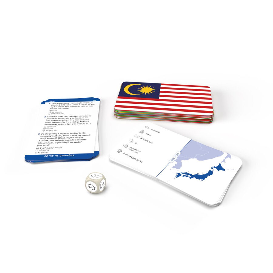 Vědomostní karetní hra, která procvičí znalosti vlajek a základních informací o státech Asie. Poznáte vlajky všech 51 asijských států? Určíte, které zemi patří vlajka, jaké má hlavní město, úřední jazyk, měnu, sousední státy nebo rozlohu? Hra obsahuje i sadu kvízových otázek o zajímavostech asijských států. Kdo první správně odpoví, získává kartu. Změřte síly v této naučné zábavné hře. Hru lze hrát samostatně nebo propojit se státy dalších světadílů z této edice. Obsah balení: 70 karet1 kostka se symbolypravidla Hlavní vlastnosti: zábavná vědomostní hramožnost rozšíření pomocí dalších verzí z této edicekompaktní rozměryvhodné i na cestyvyrobeno v ČR Zkrácený návod ke hřeDoprostřed stolu položte promíchaný balíček karet vlajkami nahoru. Hráč, který je na tahu, hodí kostkou. Symbol na kostce určí, na na kterou otázku z karty se bude odpovídat. Hráči hrají všichni současně. Kdo odpoví nejrychleji a správně, kartu získává. Hra končí, když dojde balíček karet a vyhrává ten, kdo jich získal nejvíce.