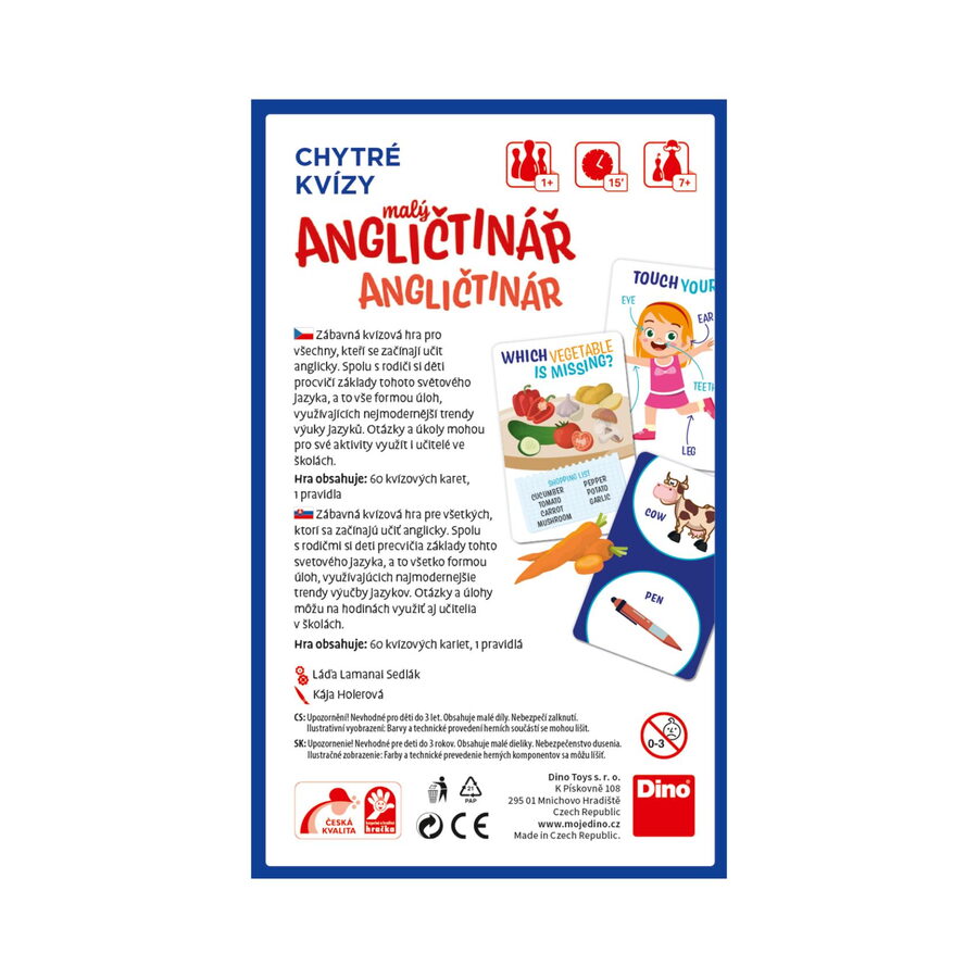 Zábavná kvízová hra pro všechny, kteří se začínají učit anglicky. Spolu s rodiči si děti procvičí základy tohoto světového jazyka, a to vše formou úloh využívajících nejmodernější trendy výuky jazyků. Otázky a úkoly mohou také využít učitelé na základních školách. Obsah balení: 60 kvízových karetpravidla Hlavní vlastnosti: pro všechny, kdo začínají s angličtinouvhodné k procvičování doma i ve školevyrobeno v ČR