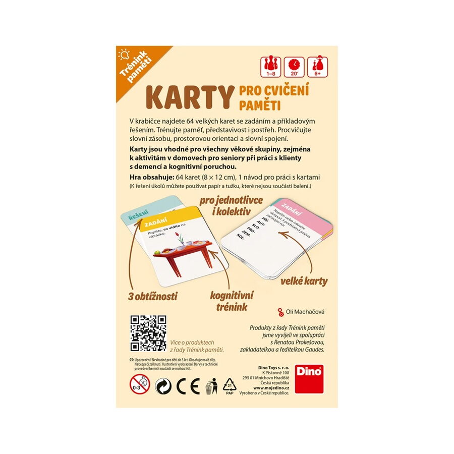Objevte kouzlo společně strávených chvil, kdy se budete bavit a rozvíjet své schopnosti. Hra je vhodná pro všechny věkové skupiny od dětí po seniory. 64 velkých karet s originálními úkoly a návrhy řešení jsou navrženy pro aktivní trénink paměti, představivosti, slovní zásoby, postřehu i prostorové orientace. Jsou ideálním pomocníkem pro pečovatele v domovech pro seniory, při práci s lidmi trpícími demencí či kognitivním oslabením, ale také pro rodiny, které chtějí smysluplně trávit čas se svými dětmi, rodiči a prarodiči. Každá karta přináší jednoduché nápadité aktivity, jež poskytují vodítko, podporují komunikaci a inspirují ke společným činnostem. Pravidelné procvičování mozku napomáhá lepší orientaci v každodenním životě, udržuje mentální kondici a přispívá k dobré náladě. Obsah balení: 64 karet návod ke hře Hlavní vlastnosti: trénuje paměť, představivost, postřeh, slovní zásobu a prostorovou orientacivhodné seniory a osoby s demencí a kognitivními poruchamivhodné pro děti od 6 lettexty na kartičkách v češtiněvyrobeno v ČR