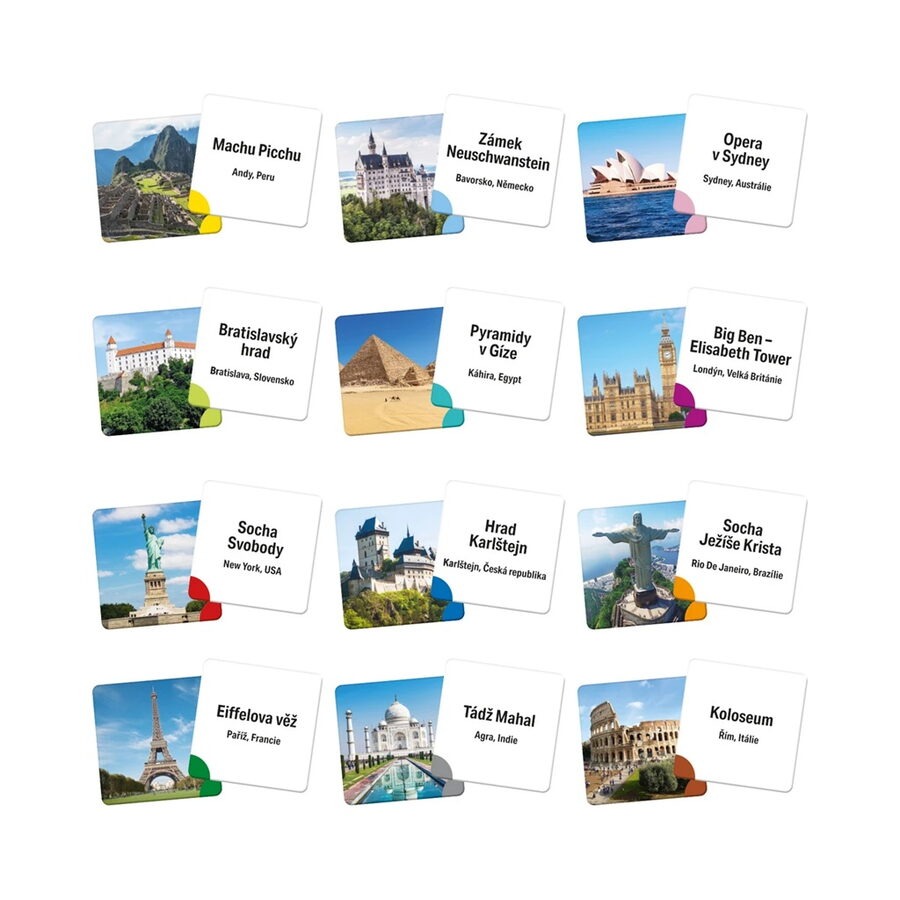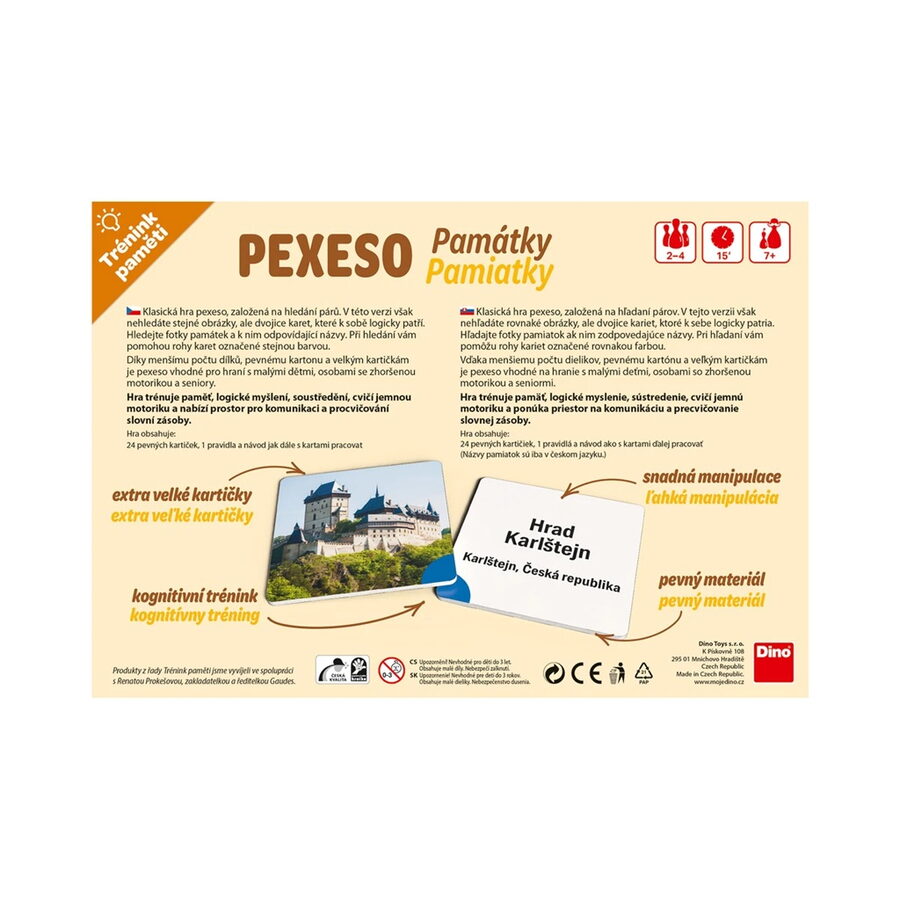 Klasická hra založená na hledání párů. V této verzi však nehledáte stejné obrázky, ale fotografie významných míst a a odpovídající názvy. Při hledání Vám pomohou rohy karet označené stejnou barvou. Díky menšímu počtu kartiček, pevnému kartonu a velkým kartičkám je pexeso vhodné pro hraní s malými dětmi a také s osobami se zhoršenou motorikou a seniory. Obsah balení: 24 kartičekpravidla Hlavní vlastnosti: trénuje paměť, logické myšlení a soustředěnícvičí jemnou motorikunabízí prostor pro komunikaci a procvičovánívhodné pro děti od 7 letnázvy památek v českém jazycevyrobeno v ČR Zkrácený návod ke hřePexeso obsahuje dvojice kartiček – obrázek památky a její název. Kartičky zamíchejte a rozložte lícem dolů. Hráči se střídají a v každém tahu otočí dvě kartičky. Pokud tvoří správnou dvojici, ponechají si je a pokračují ve hře, jinak je otočí zpět. Vítězí ten, kdo nasbírá nejvíce dvojic.