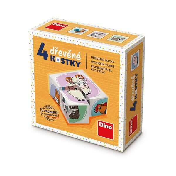 Se zvířátky si děti rozumí často už od kolébky. Kravička, ovečka, kohout či pejsek ze dřevěných kostek zaručeně nebudou výjimkou. Ze čtyř barevných krychliček si mohou už ty nejmenší děti zkoušet skládat obrázky šesti různých zvířat nebo svůj první komín. Skládat mohou podle předlohy nebo i bez ní. Hlavní vlastnosti: kostky se vyrábí z českého smrkového dřeva v naší ryze české továrně Dino Topaoblíbená hračka pomáhá dětem rozvíjet nejen fantazii a tvořivost, ale také motorické schopnostike složení obrázku mohou menší stavitelé používat předlohu, starší to zvládnou bez níkvalitní přírodní materiál přežije celou generaci a je zdravotně nezávadnývyhrají si s nimi šikulové od 3 let