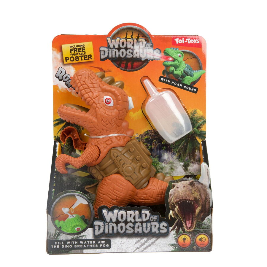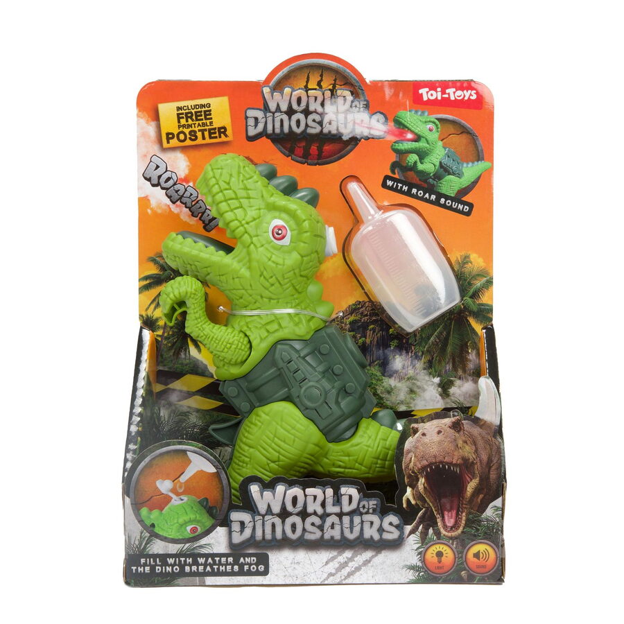 Dinosaurus pistole plast 13x16cm vypouštějící páru na baterie se světlem, zvukem 2 barvy v krabičce