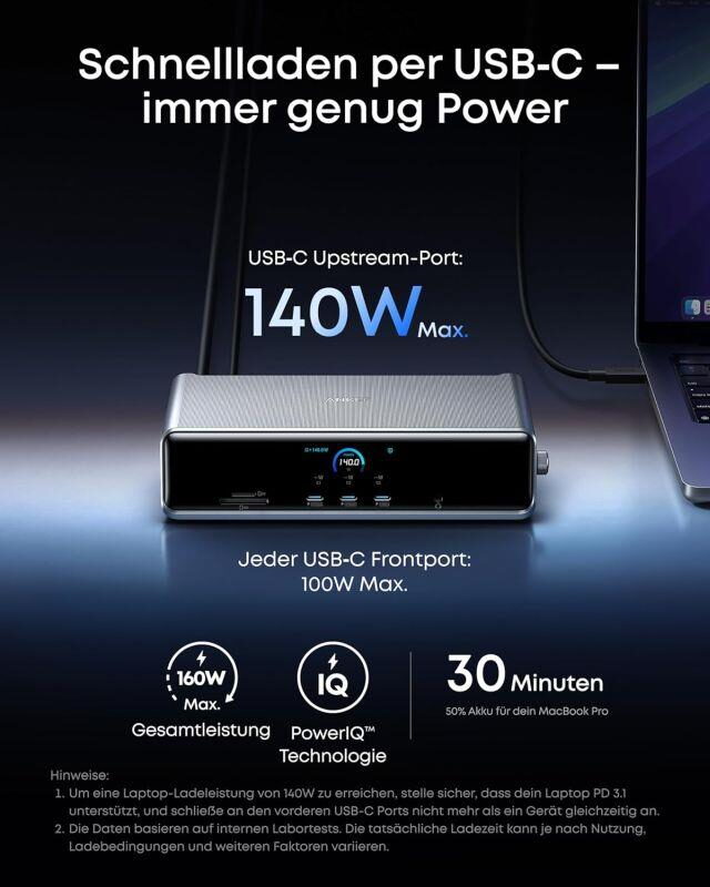 Nabíjejte svůj notebook s výkonem až 140 W přes upstream port, zatímco přední porty USB-C poskytují vysokorychlostní výkon 100 W.