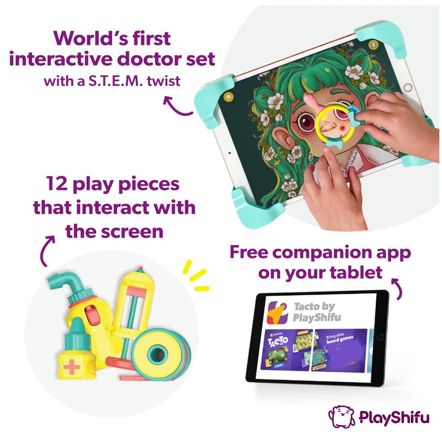 Staň se opravdovým doktorem s novinkou Doktorský interaktivní set. Hra, která moderně spojuje učení, motoriku, představivost a digitální gramotnost, zabaví děti, rodiče i učitele. Proměň svůj tablet na doktorskou ordinaci, urči diagnózu pacientů a vyleči jejich nemoce. Vše dokážeš pomocí aplikace a přiložených nástrojů v doktorském kufříku – teploměr, stetoskop, tlakoměr, rentgen, lahvička s léky a další. Celkem v balení naleznete 12 nástrojů, 4 rohy k přiložení na váš tablet, návod. Elektronické zařízení (tablet) není součástí balení. Vhodné pro děti od 4 do 8 let.